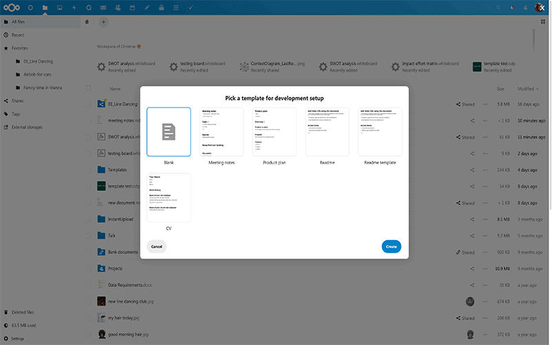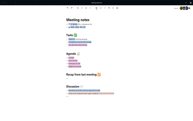 Nextcloud Hub 21 features a Whiteboard extension that allows multiple users to draw, attach images, take notes and write text in the same space in real-time. The files created with Whiteboard are saved with the other files and can be shared with others.