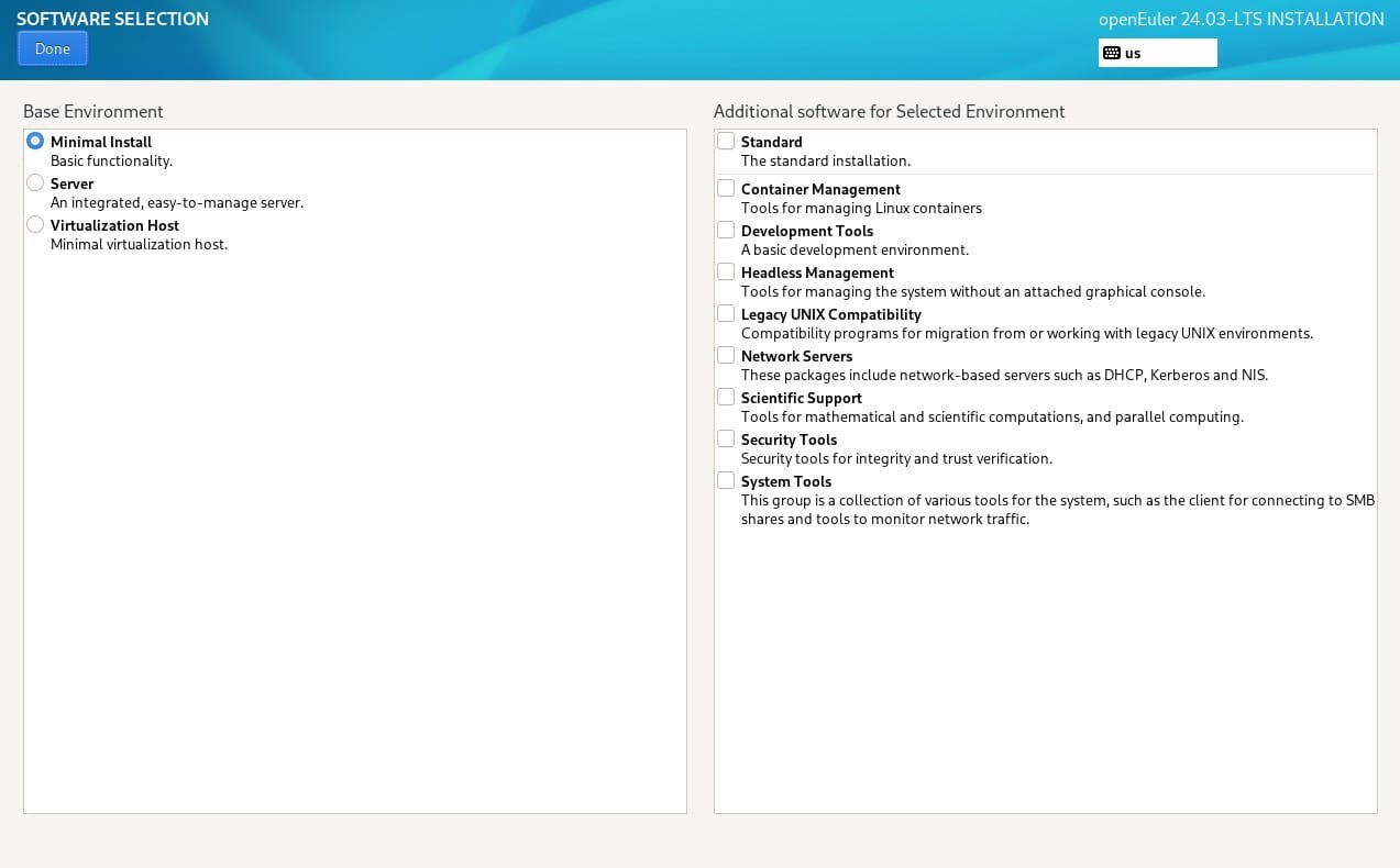 openEuler 24.04 LTS offers a couple of ISO variations. You can download the ISO that includes everything (21.2 GB), the standard ISO (3.9 GB, which I test here), and the network install ISO (896 MB).