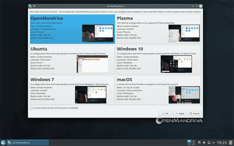 Users can now choose from six different desktop presets (including the vanilla OpenMandriva preset) for a tailored desktop experience.
