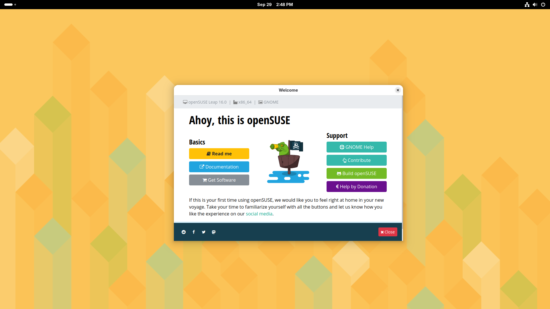 The Welcome and About dialogs on a fresh openSUSE Leap 16 installation.