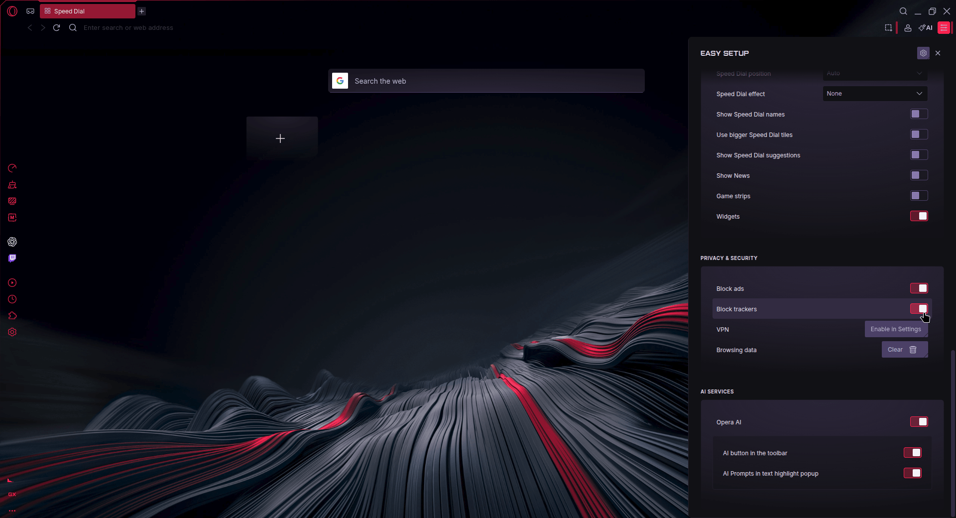 On the left are the toggles to configure the ad blocker and Opera AI. On the right are the sponsored speed dials.