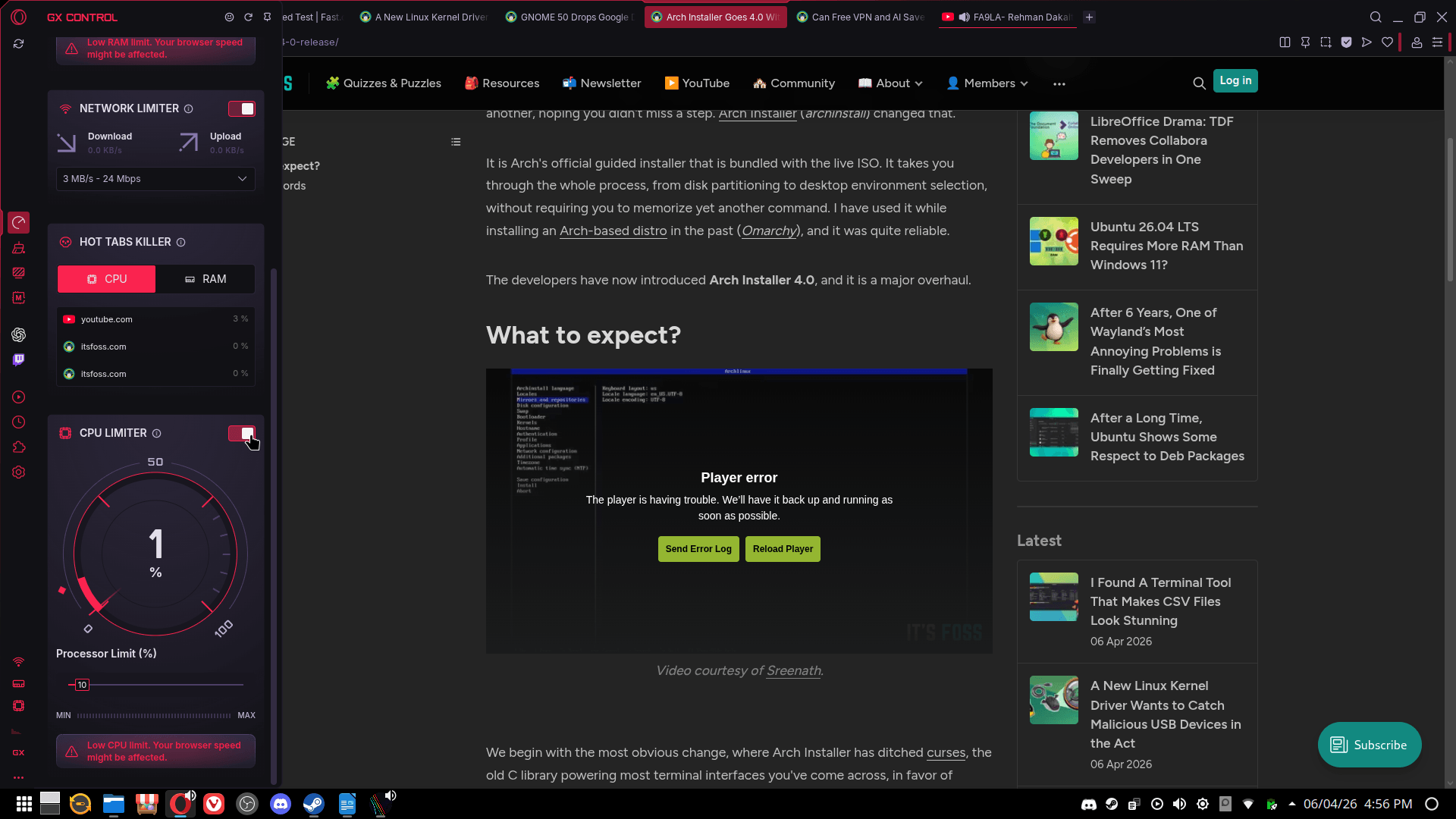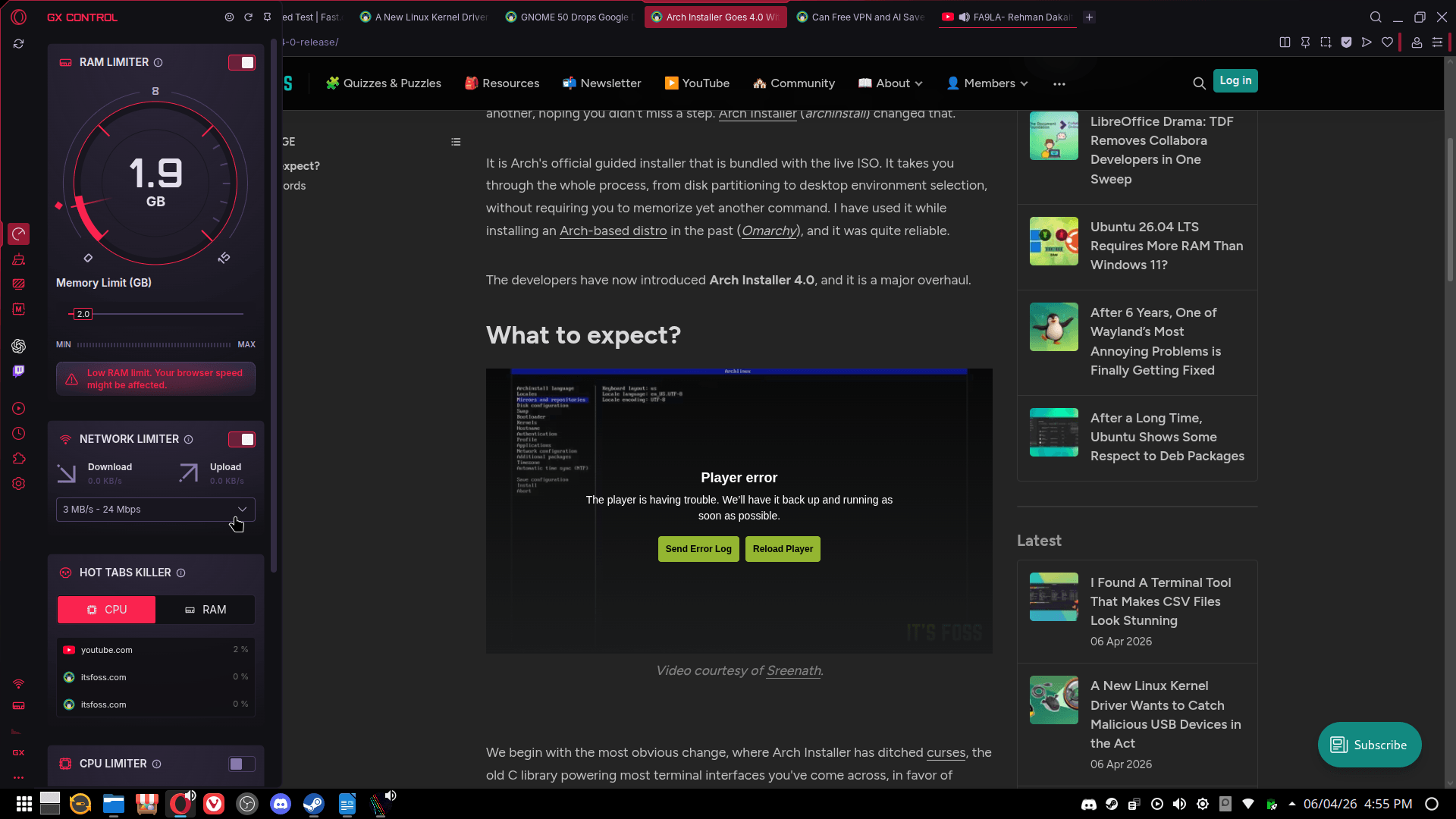 I took Opera GX for a run on a Nobara Linux 43 setup, using an Early Access version to test it across various scenarios ranging from general browsing to playing YouTube content to running internet speed tests.