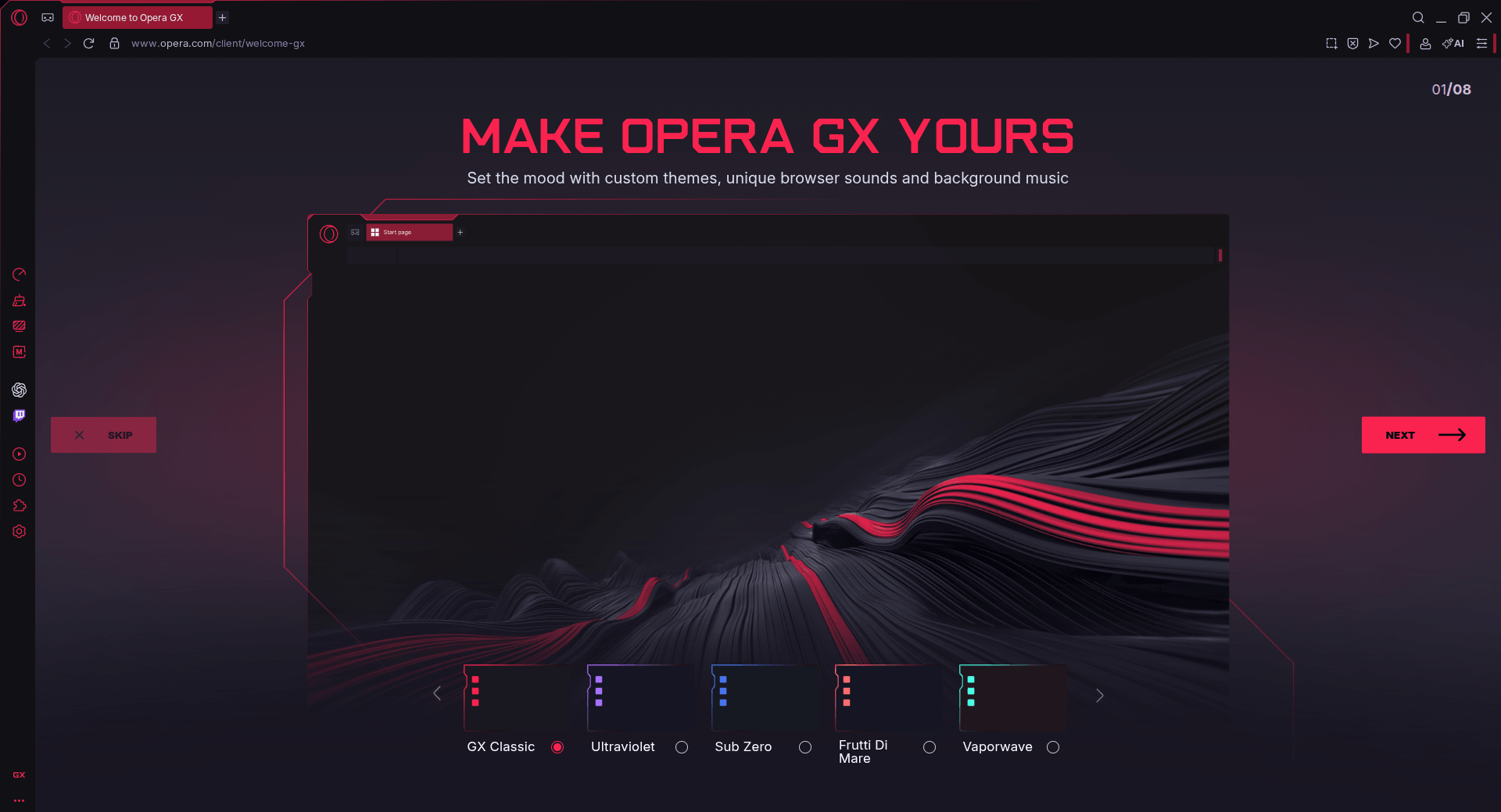 On first launch, the browser asked me if I wanted to send telemetry; I declined and moved on to the initial setup. It asked me to pick a theme, and I went with the default GX Classic since it felt more Opera than the rest.
