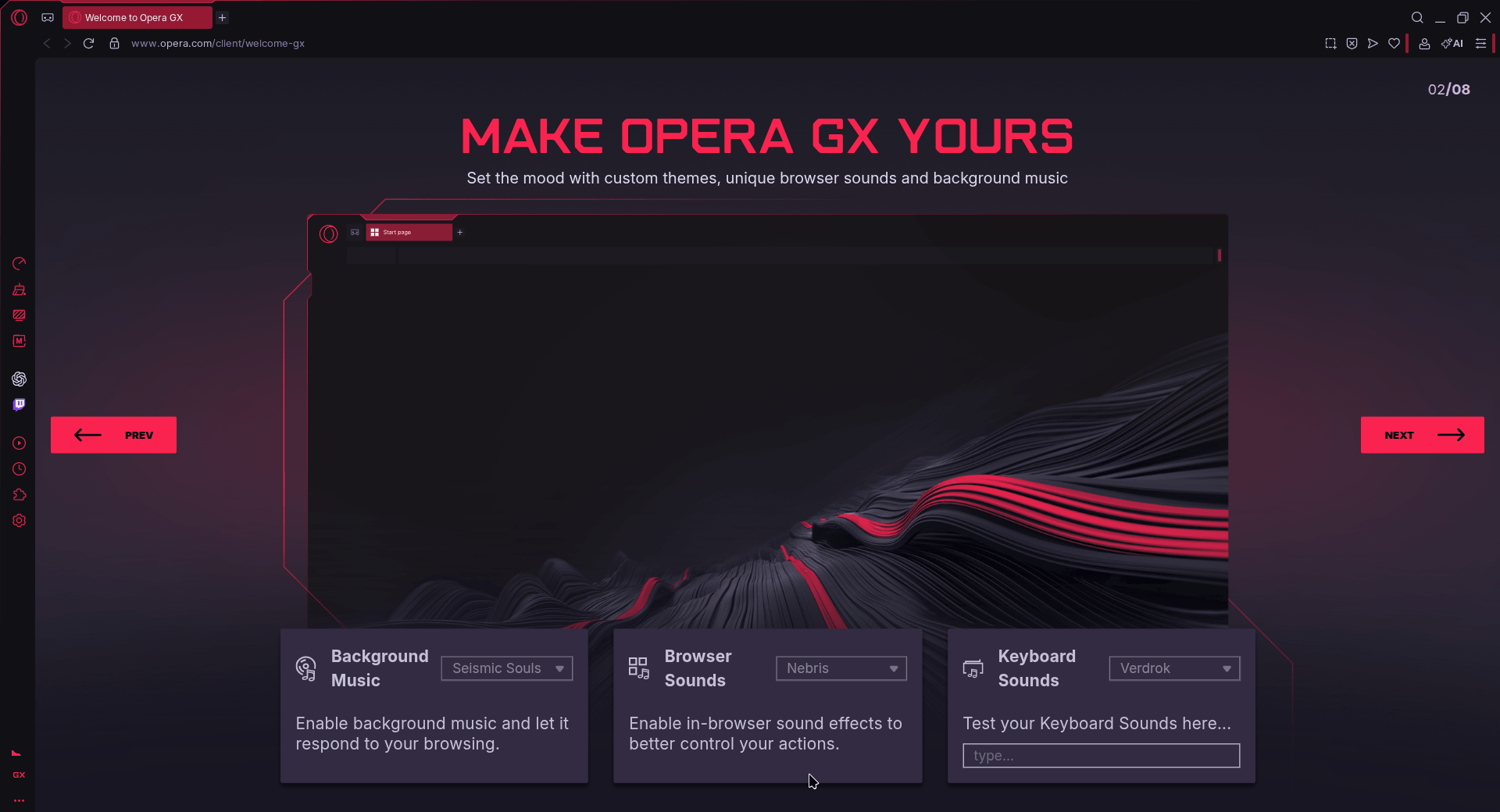It then asked whether I wanted background music that reacts to my browsing, sound effects for in-browser actions, and keyboard sounds as I typed. I left all of these at their defaults since, honestly, they went right over my head (don't call me a boomer pls).