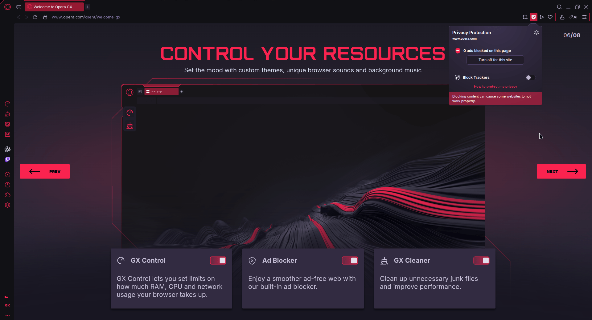 The next step involved me manually turning on the ad blocker (and later the block trackers option), but the other two features, GX Control and GX Cleaner, were toggled on by default.