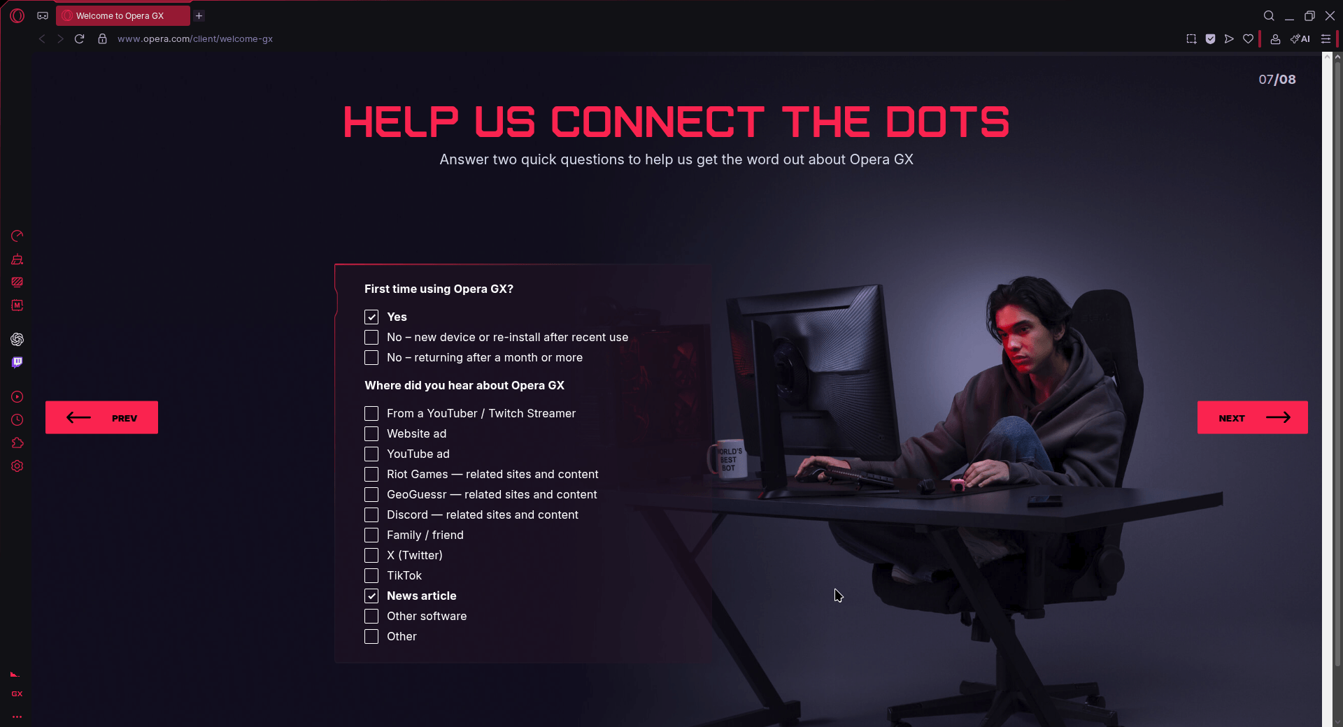 Opera GX on Linux new user onboarding continued.