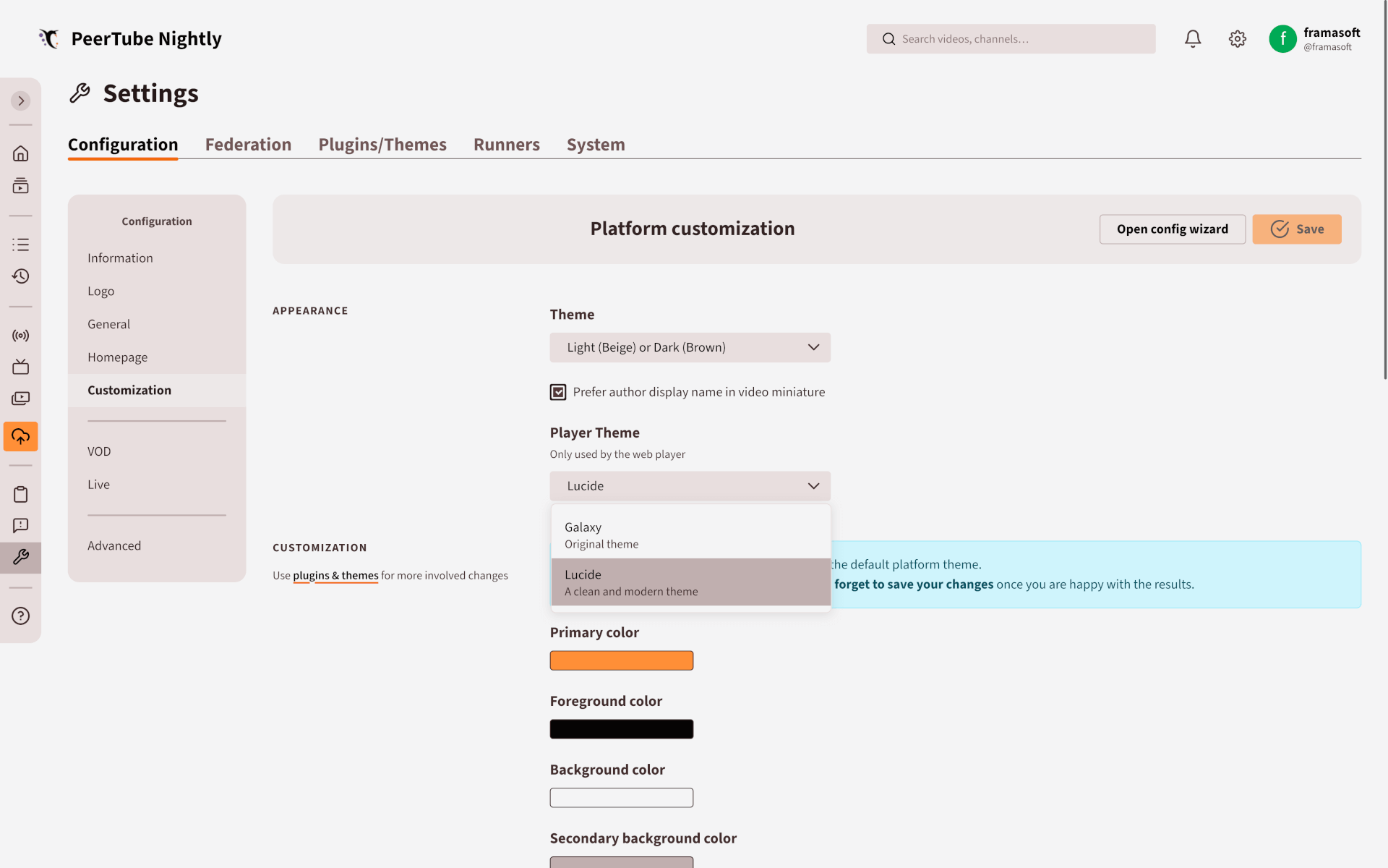 PeerTube V8's team collaboration feature and theme selector. (Source: Framasoft)