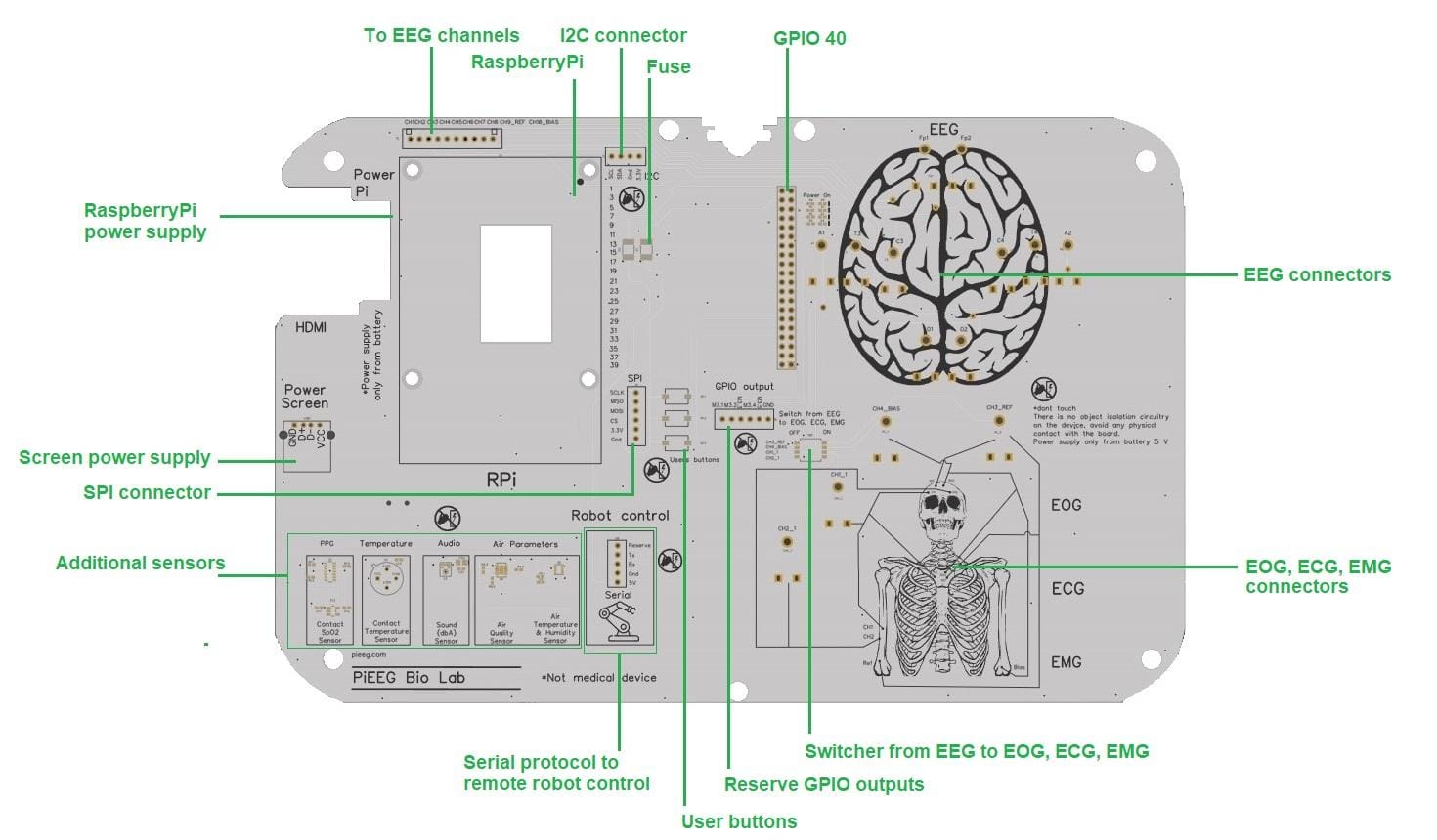 On the hardware side of things, the PiEEG kit is powered by the PiEEG Shield, which connects directly to a Raspberry Pi, handling the capture of biosignals like EEG, EMG, EKG, and EOG.