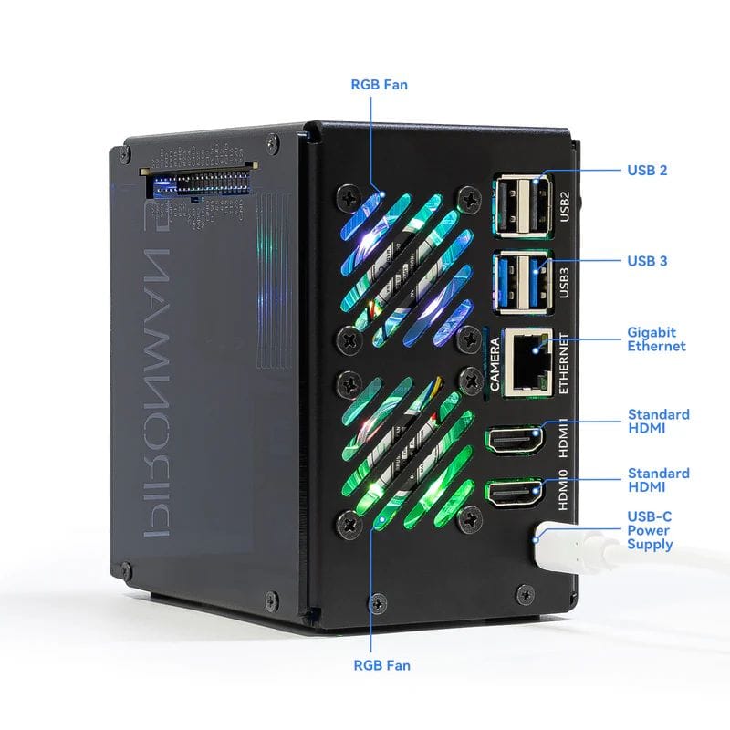 As for the cooling, the PWM tower cooler is still around, but the two RGB fans have been upgraded with programmable RGB LEDs, offering more control over the lighting of the Pironman 5-MAX.