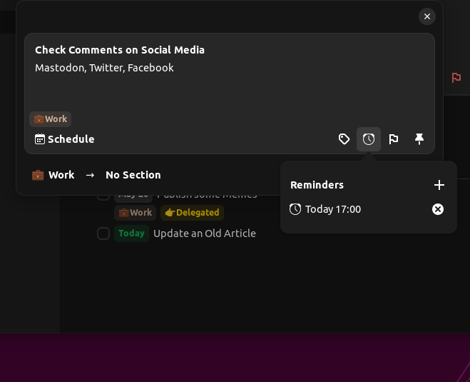 Planify would also send notifications for tasks with a reminder; they generally popped up just a few seconds after the set time came up.