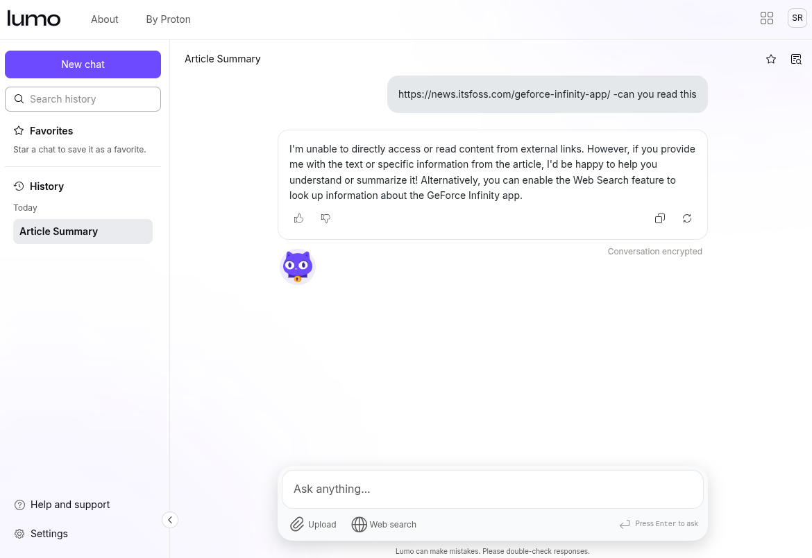 Next, I directed it to summarize an article of mine, and it threw an error. Turns out, Lumo cannot access any kind of external web link to gather information. So, I pasted the article’s content instead, and it gave me a useful summary. There was a minor mistake in point number four about status notifications, but that was okay.