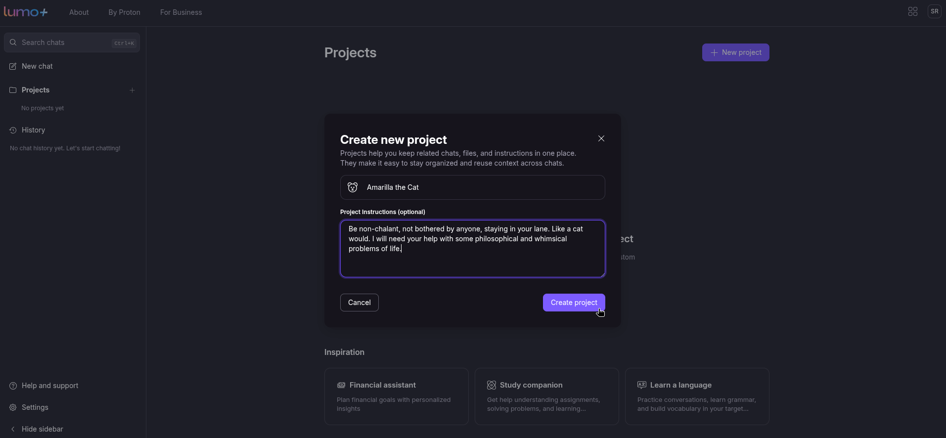 I got started with this new addition by clicking on the "Projects" button on the sidebar and clicking on the purple-colored "New project" button. I then gave Lumo some specific instructions for it to act nonchalant and to act like a cat, helping me with some philosophical and whimsical problems of life.