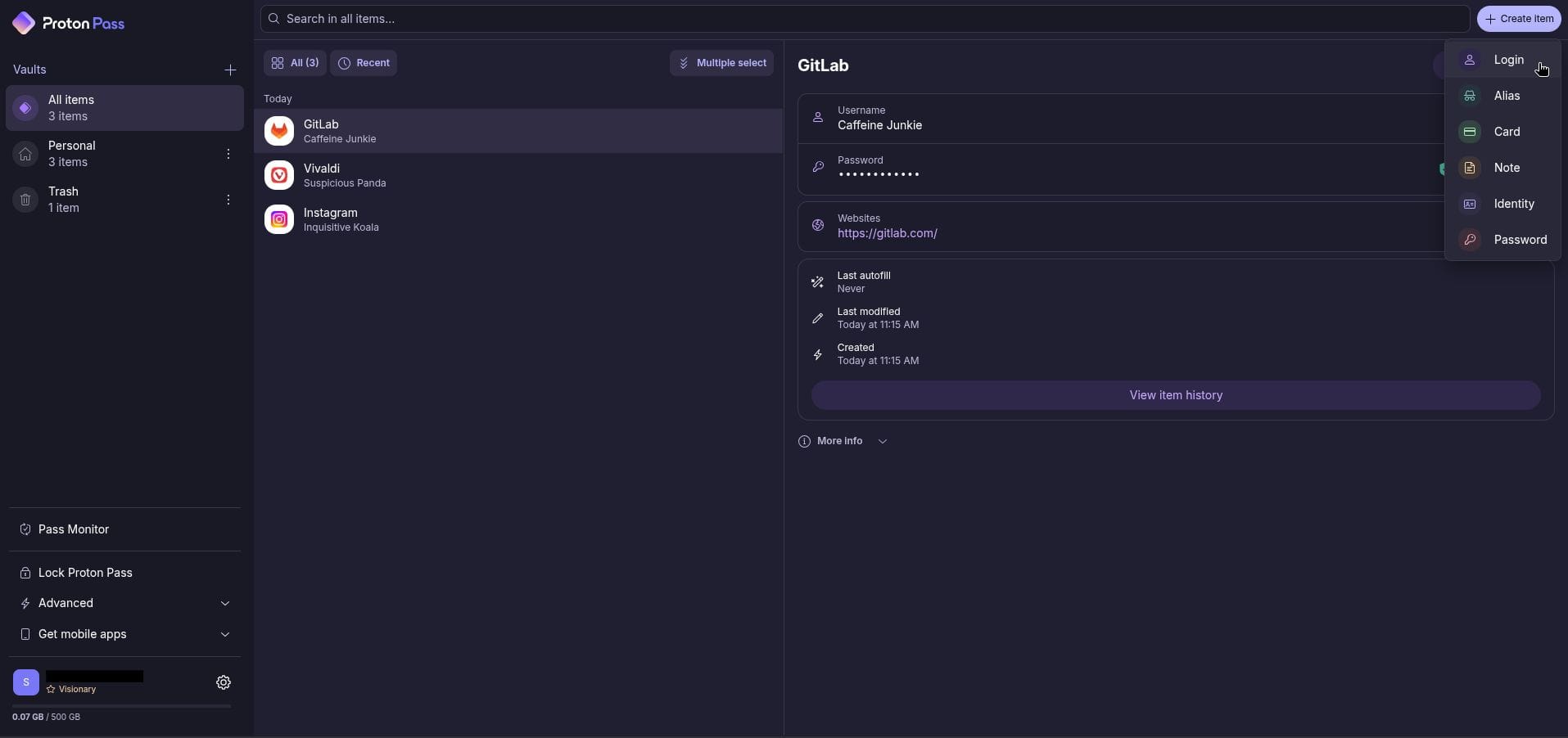 If you use the Proton Pass Web App or one of the desktop applications, then it is quite straightforward to add file attachments. Create a new entry by clicking on "Create Item", select the entry type, and enter the relevant details.