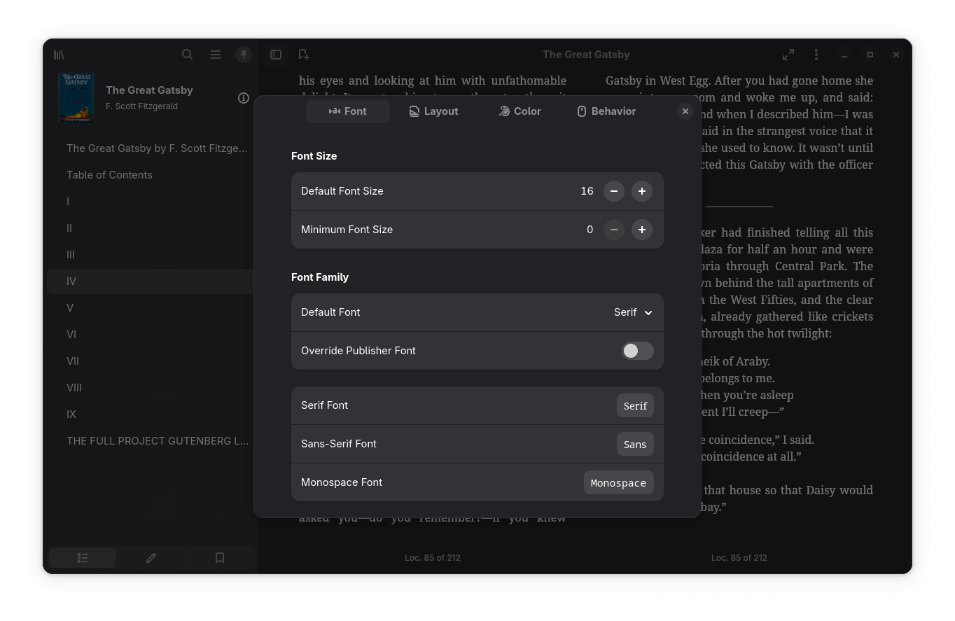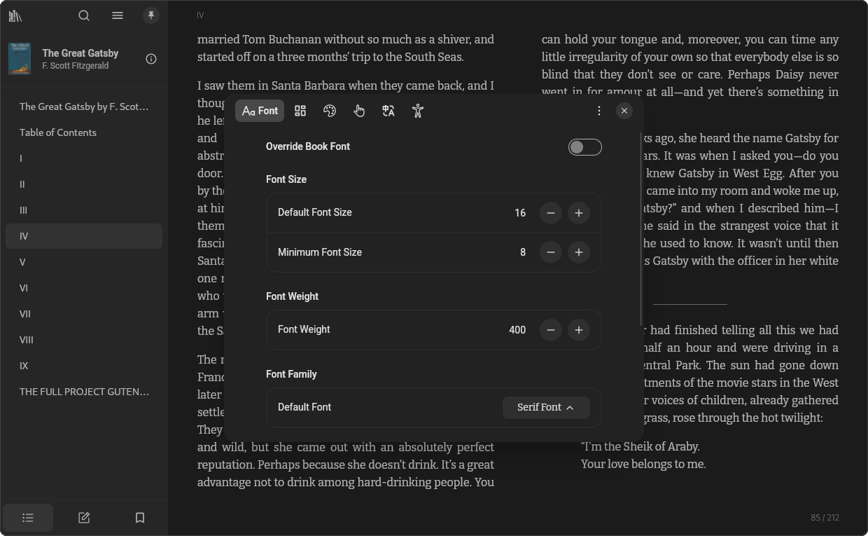 Foliate, on the other hand, sticks to the basics, offering things like font size, line spacing, margins, and a few theme options.