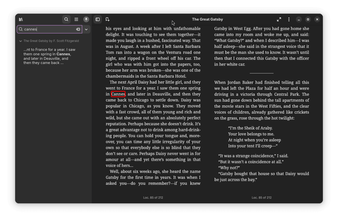 When it comes to searching for specific words or paragraphs, both Foliate and Readest perform well. On Readest, however, the search term is highlighted in the sidebar with a more vibrant color than Foliate (I know, I’m nitpicking).