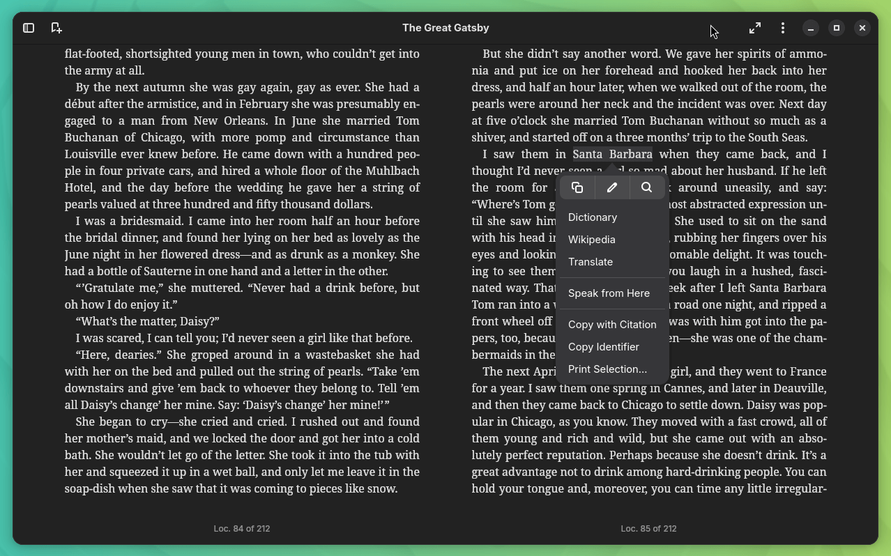Foliate has a similar set of options, including copy to clipboard, highlight, find, dictionary, Wikipedia, and translate, with additional options like copy with citation/identifier and print selection.
