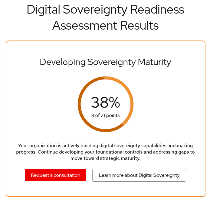 I ran a dummy assessment on Red Hat's version to see how the tool worked, and it was nice, I guess? I filled out the form with random answers, and the result was a 38% maturity score, with a breakdown of readiness across 7 digital sovereignty domains and some recommended moves I could take to improve the score.