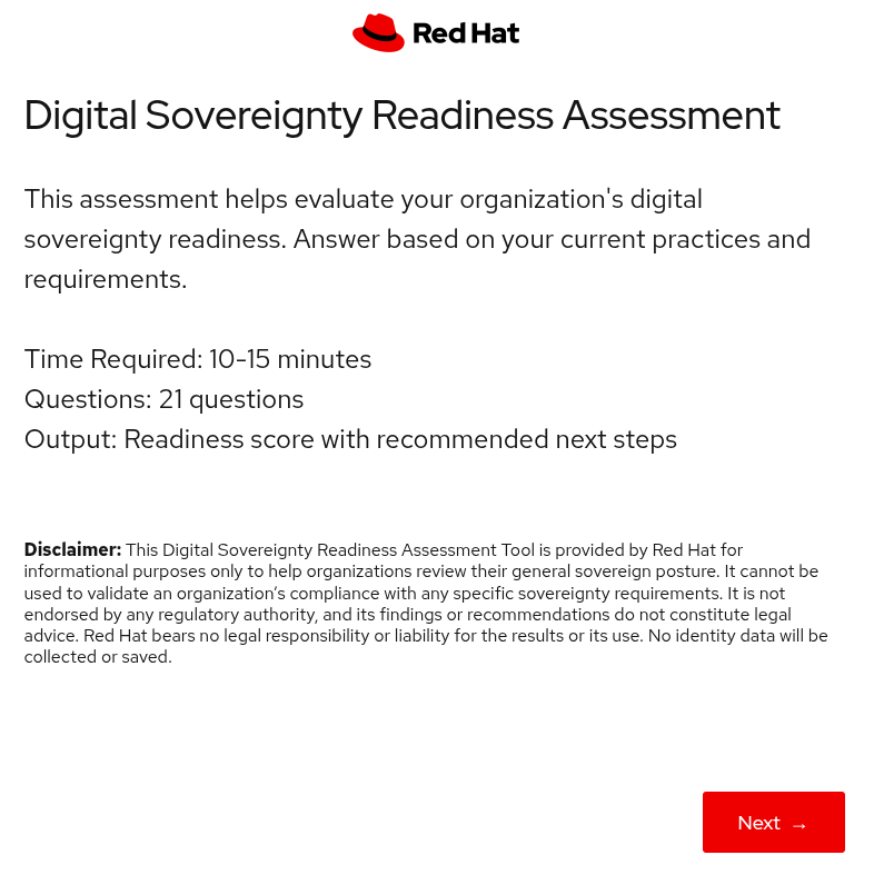 Red Hat has released the Digital Sovereignty Readiness Assessment, a self-service web tool that helps organizations figure out digital sovereignty. It is open source, released under the Apache 2.0 license, and available on GitHub (linked below).