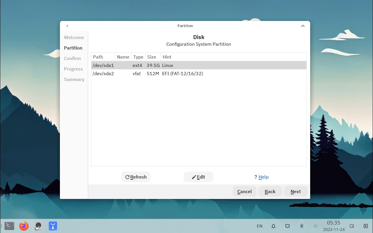 The installer also provides useful hints regarding the partitions, denoting 'Linux' for the larger one, and 'EFI' for the smaller one.