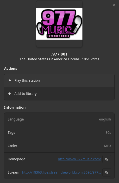 The station information dialog window now displays more information like the option to copy stream URL. You can then paste this URL in your favorite video player that supports streaming audio source like VLC to play it.