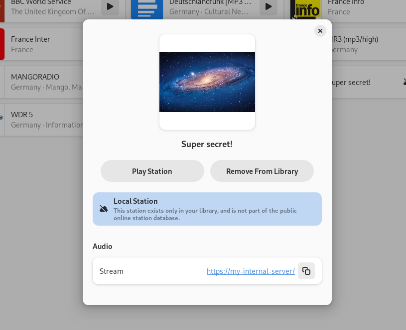 Now, you can add your private stations from your internal network or maybe an exclusive/paid stream available through an API key.