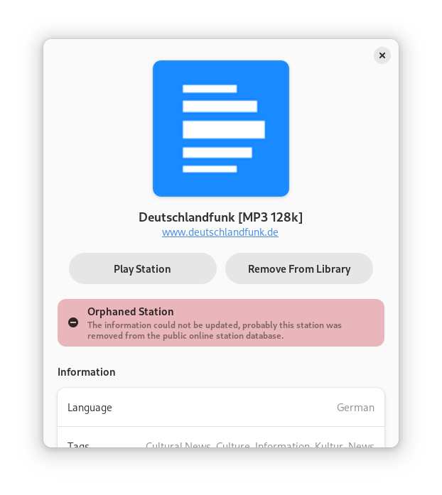 As a result, even if a station is removed from the server (radio-browser.info), it will remain in the app, with a message notifying the user of the change.