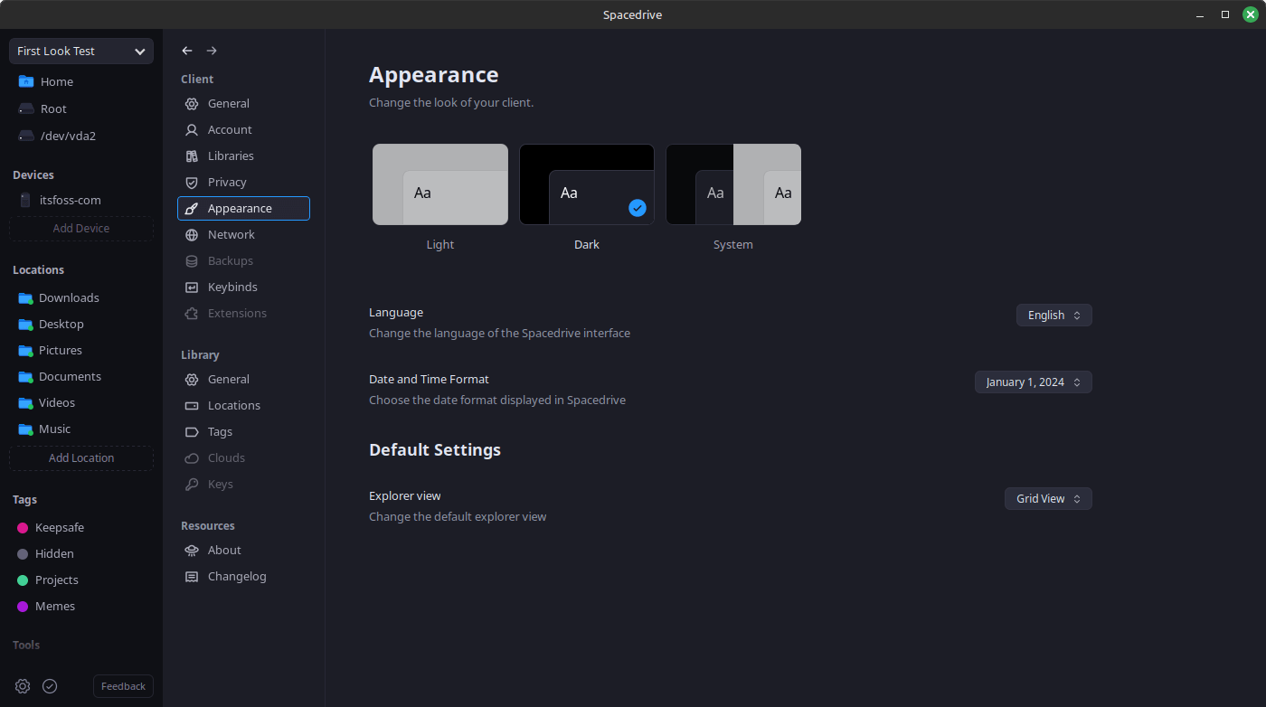 There were other settings that I didn't really touch, except the Appearance menu, which had handy options to switch between light and dark mode, with toggles for language, date/time format, and the default Explorer view.