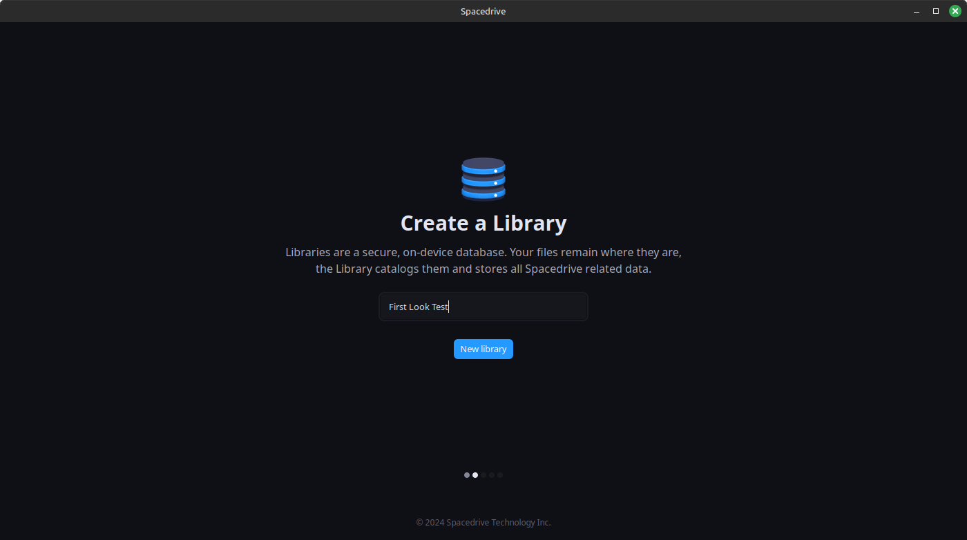 On the first launch, a quick setup wizard started up, welcoming me into Spacedrive. When I proceeded, I was prompted to create a library that would store information about the files, but not the files themselves.