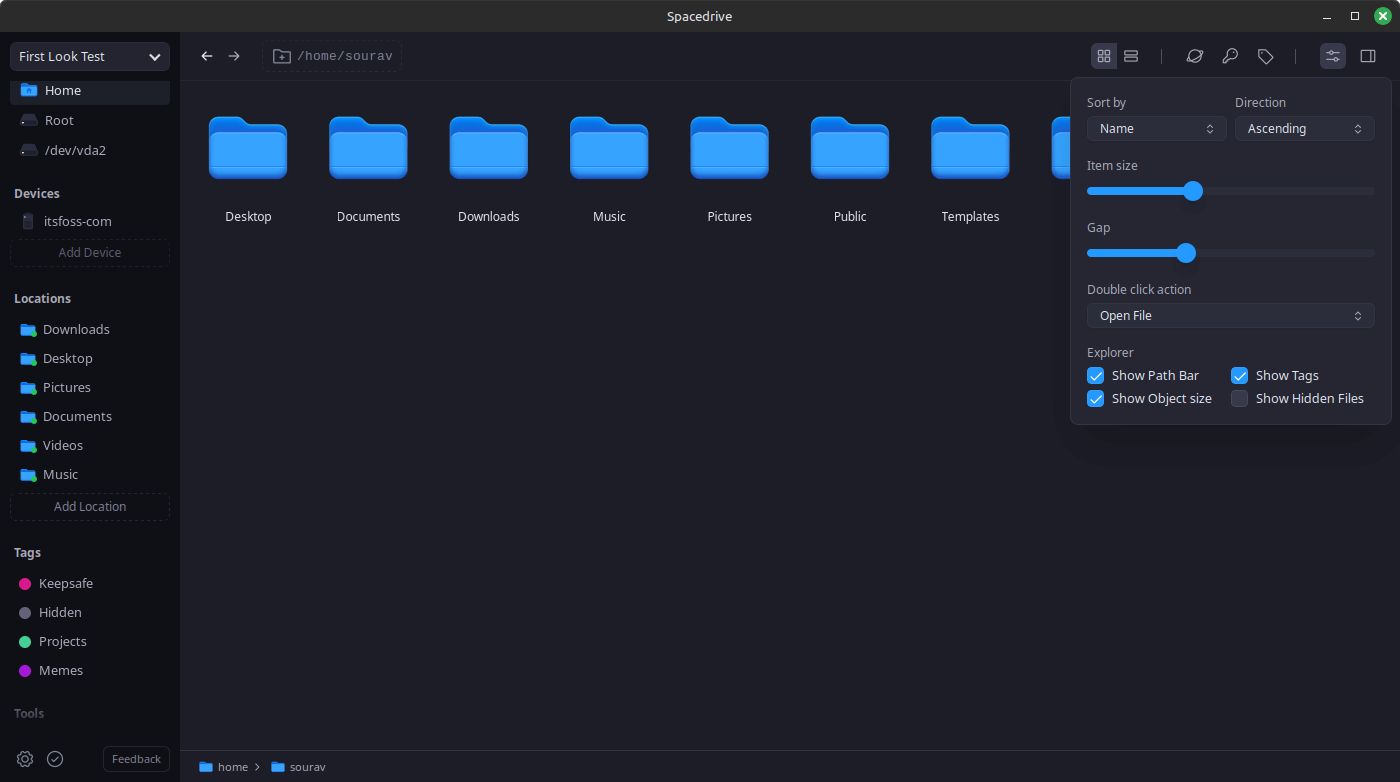 At the top, there are controls to search for files, sort the arrangement of files/folders, change the item size, the gap between them, modify the double-click behavior, and toggle some interface elements.