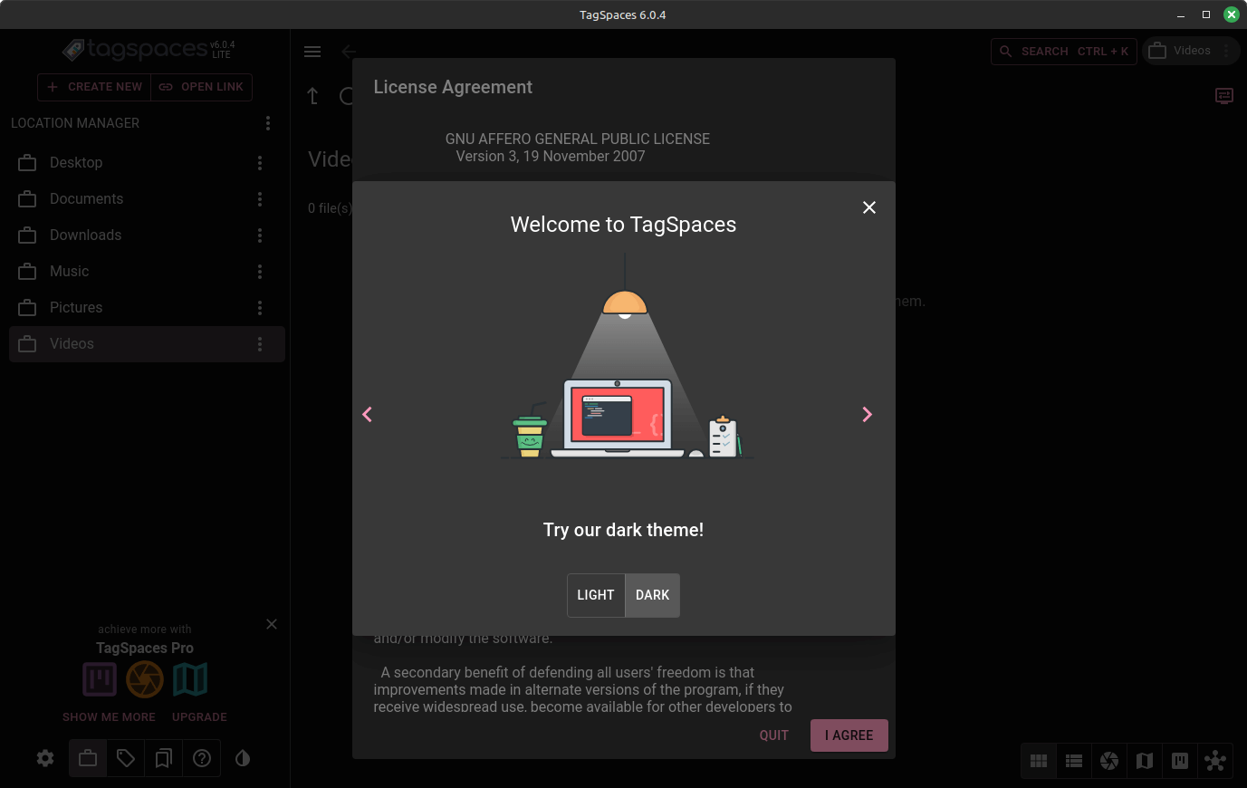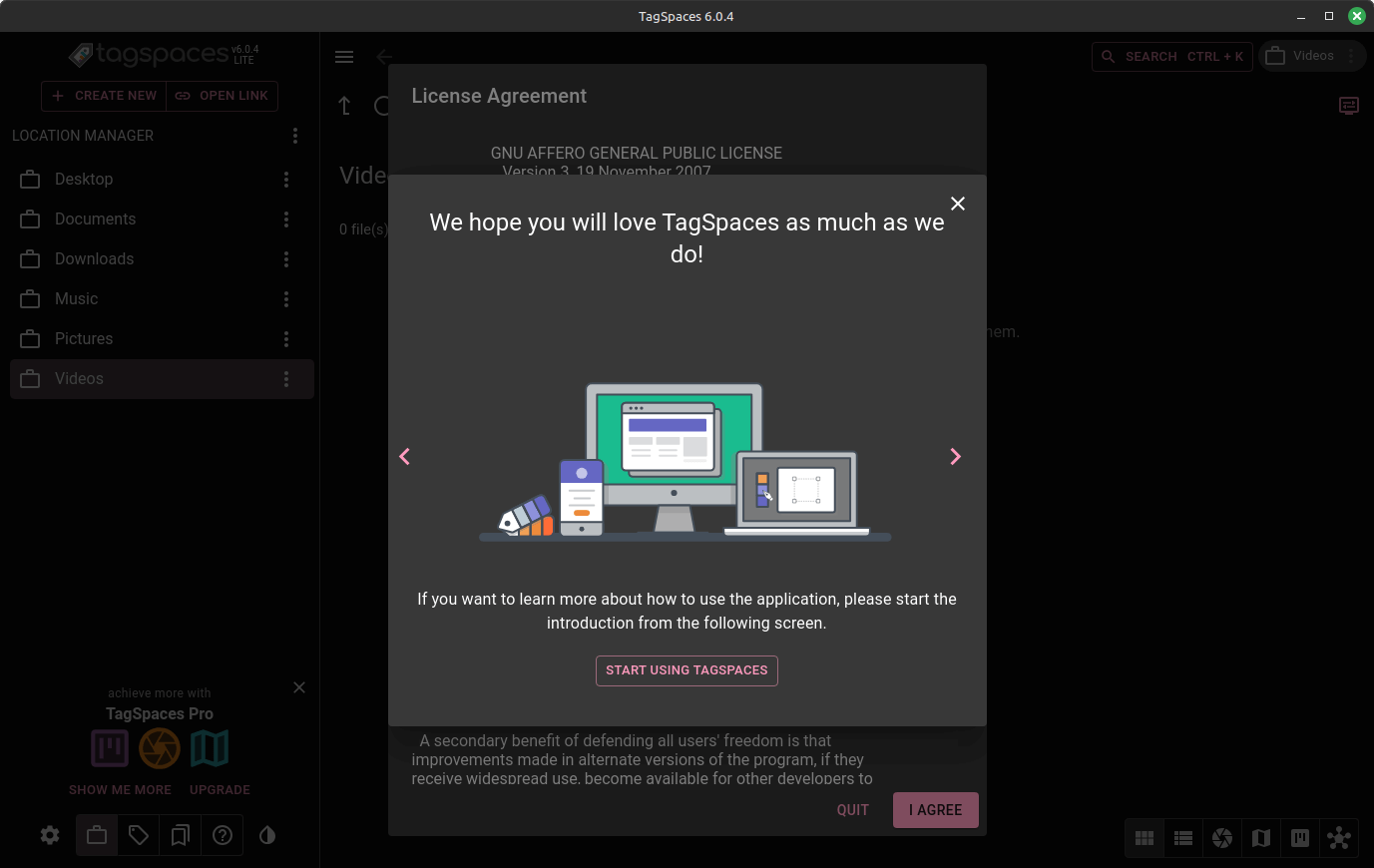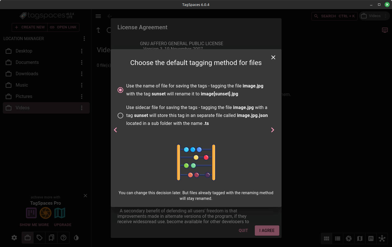 The onboarding flow took me through a short intro, showing what TagSpaces can do, letting me select the file tagging method, and what was included in the paid Pro plan (if you choose to opt for it).