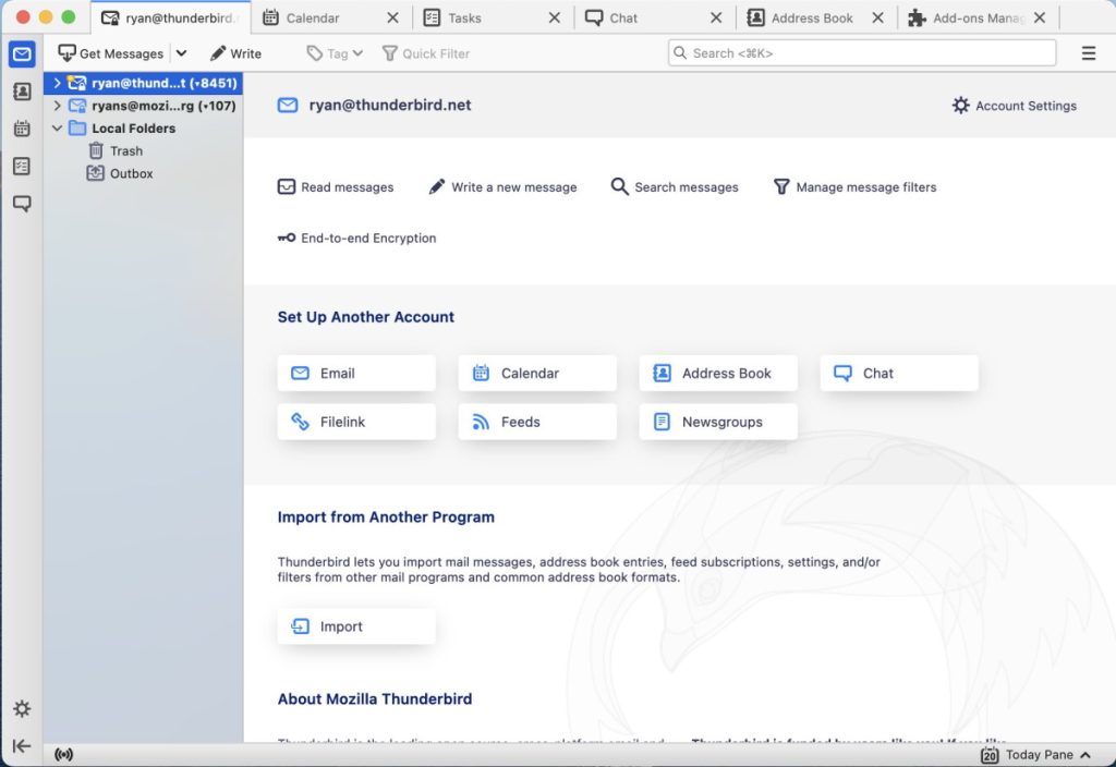 Thunderbird 102 improves the experience for all the account setup functions, like adding an account, managing the calendar, importing profiles, and more.
