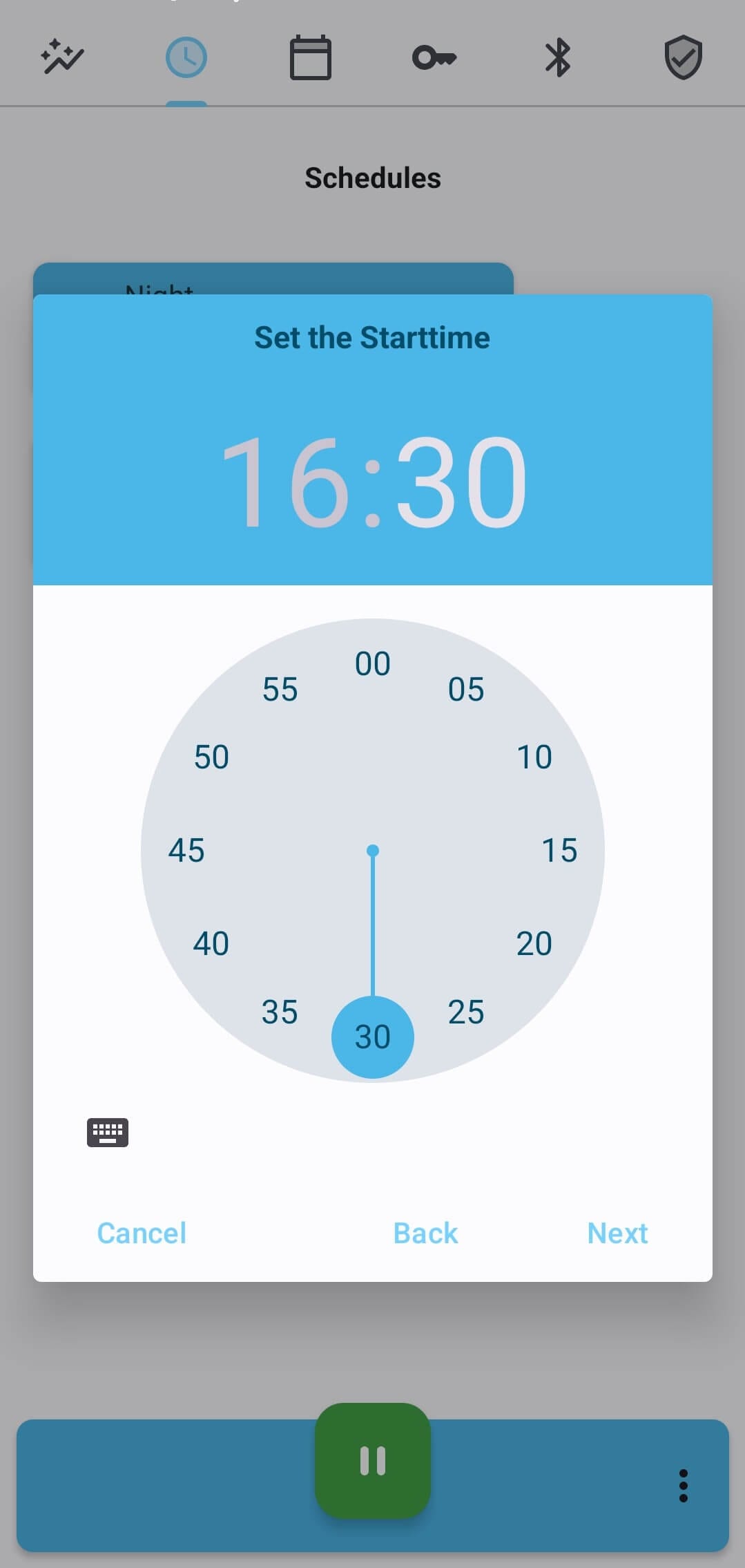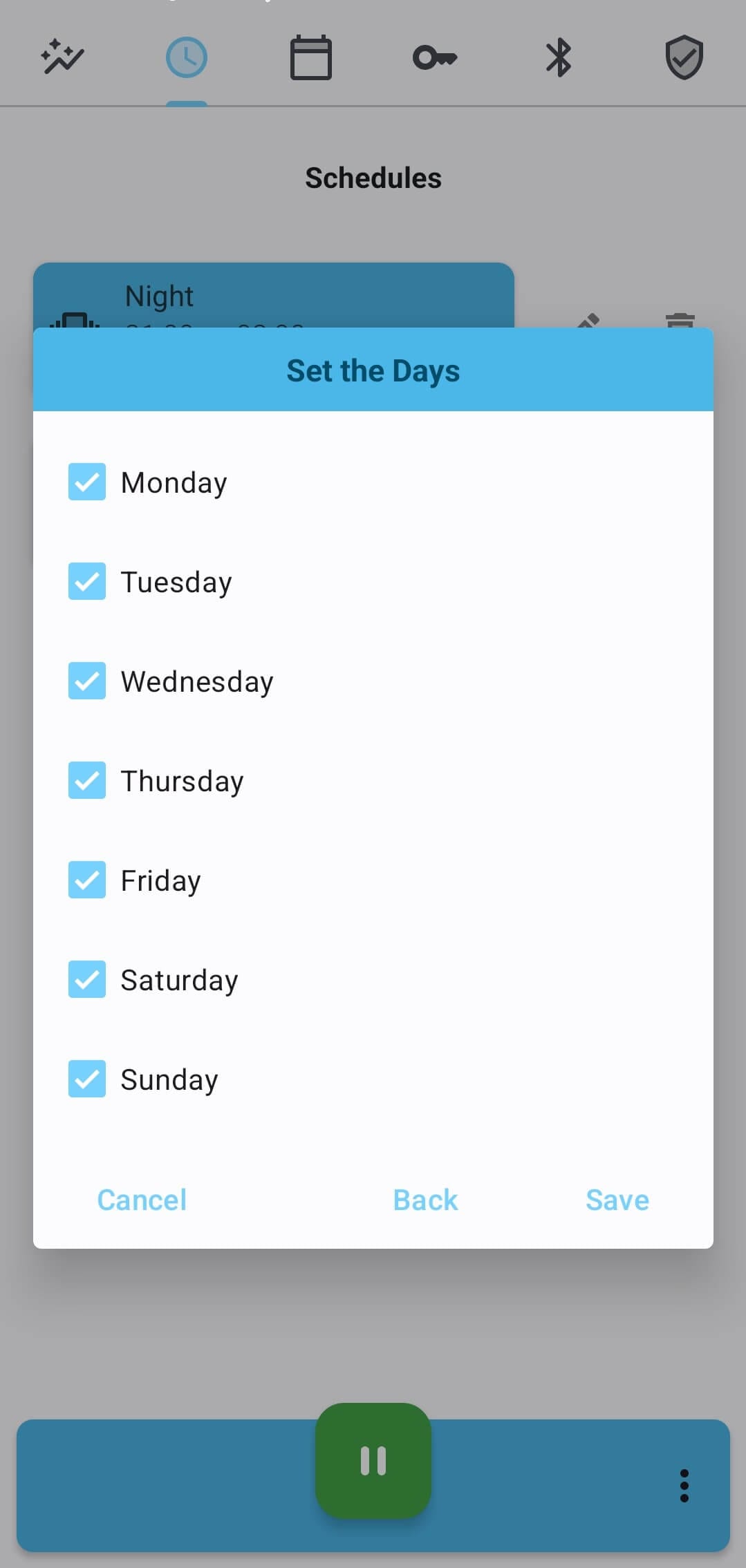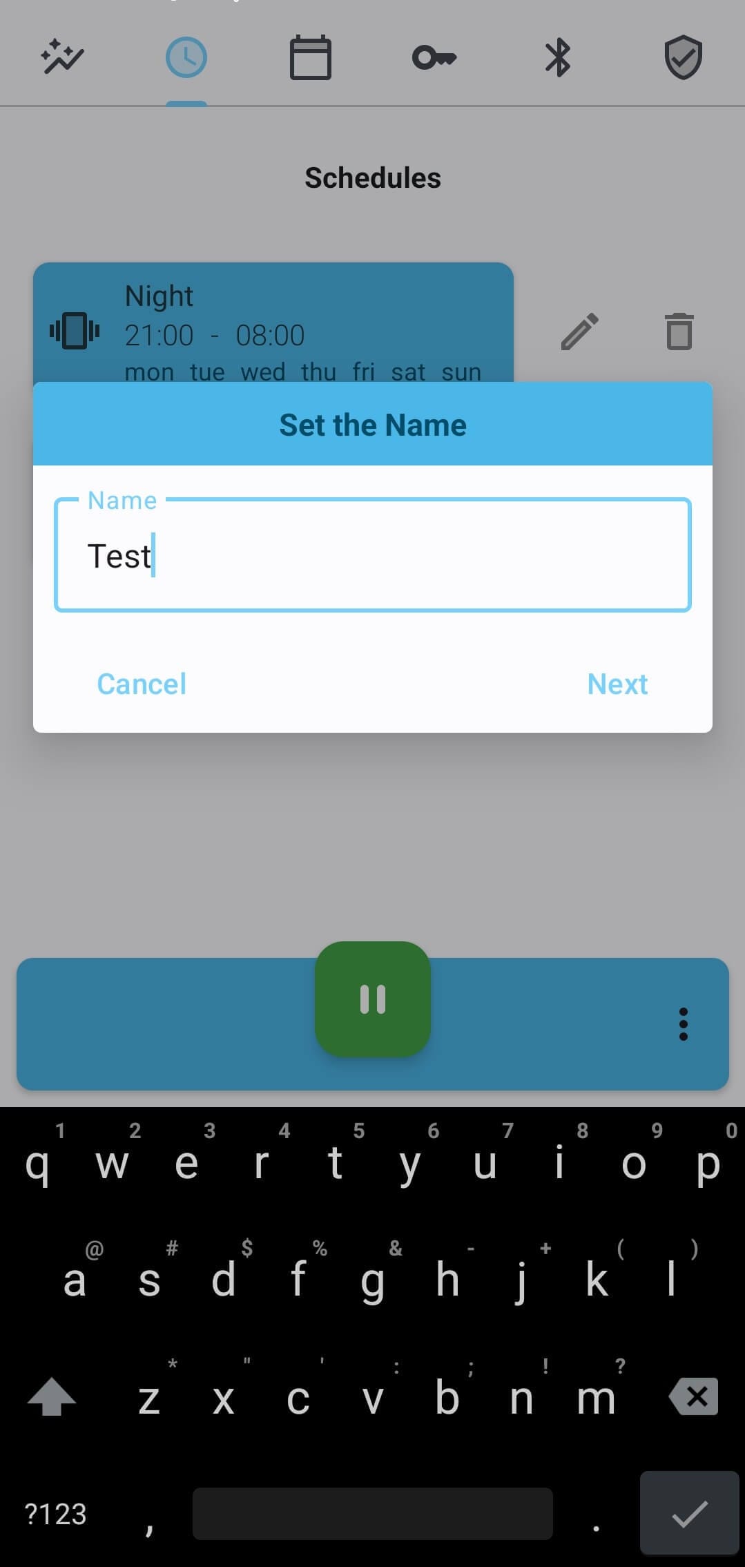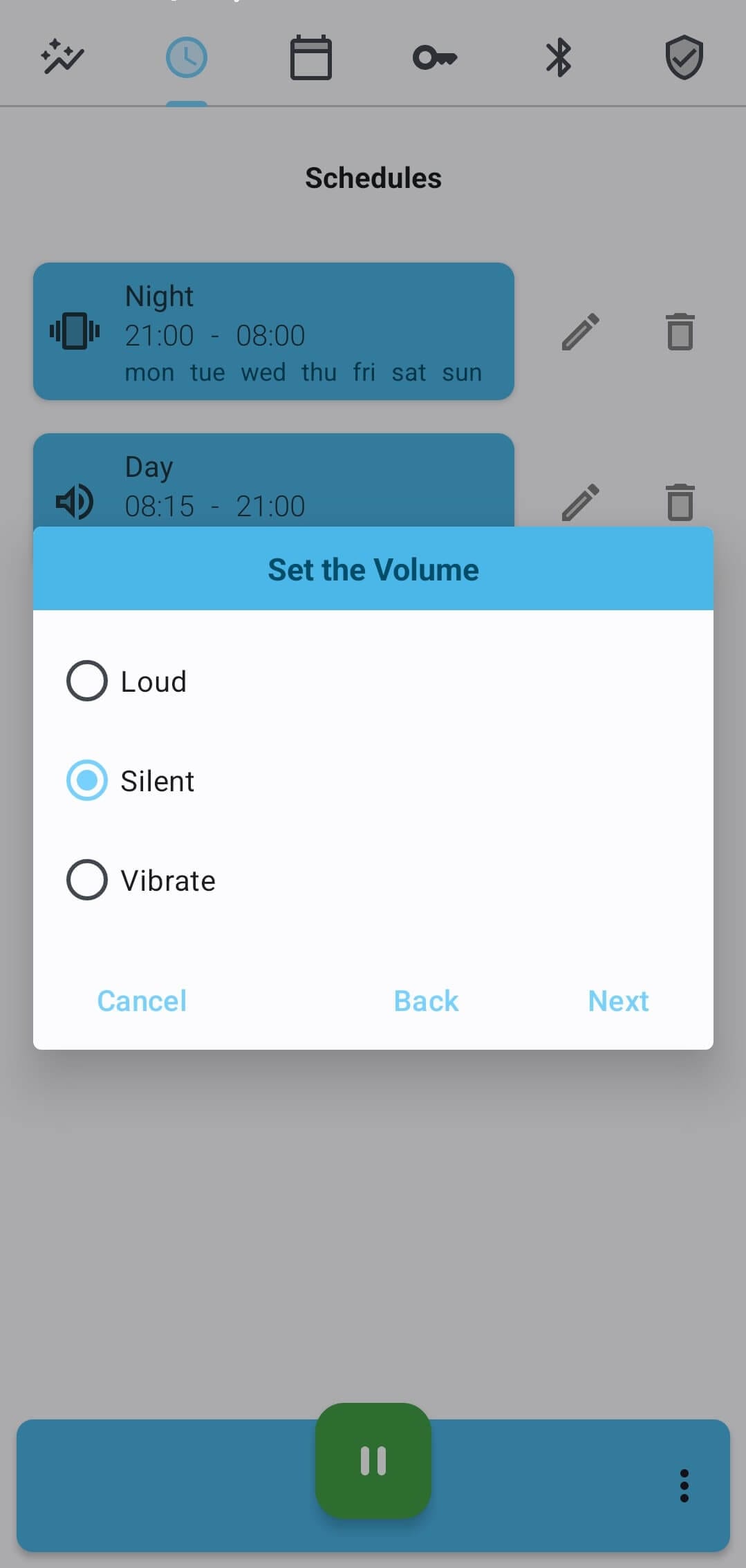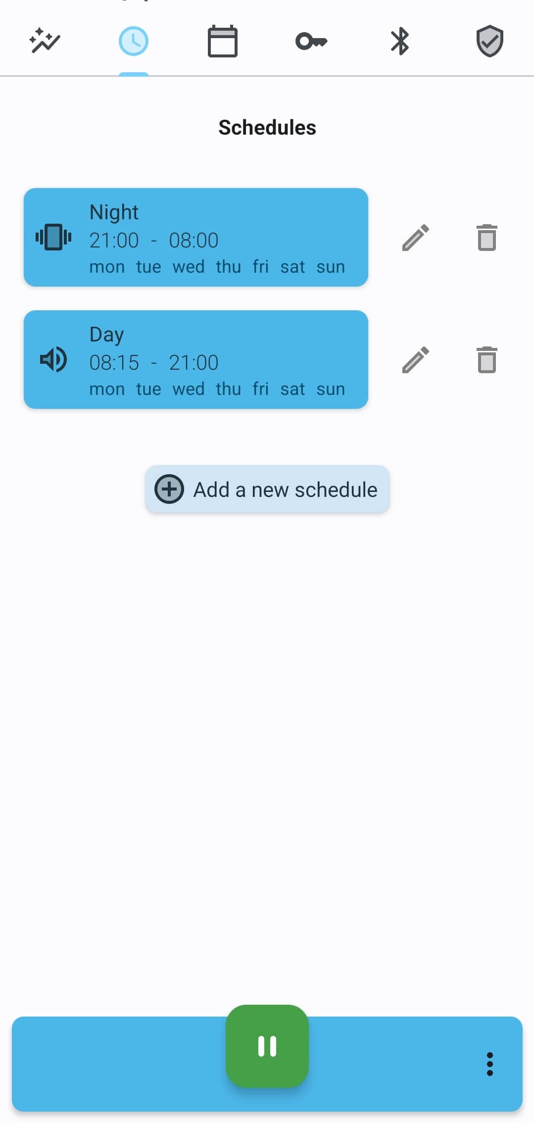 The interface felt easy to use, with a pause/play button at the bottom to control the app's activation. I created a new schedule called βTestβ, where I set the volume to be silent. There were two pre-created schedules called βNightβ and βDayβ too.