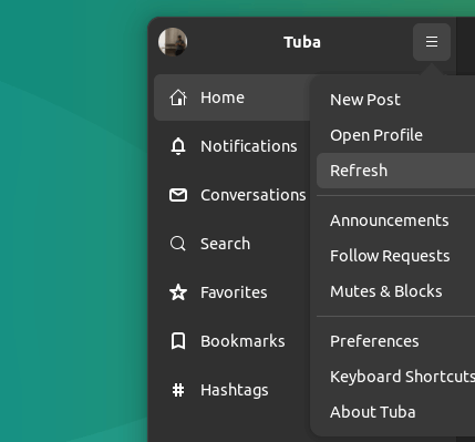 For that, I went into the hamburger menu at the top left of Tuba, where there was an option to “Open Profile”, it also had other helpful options such as to see follow requests, muted/blocked accounts, keyboard shortcuts and more.