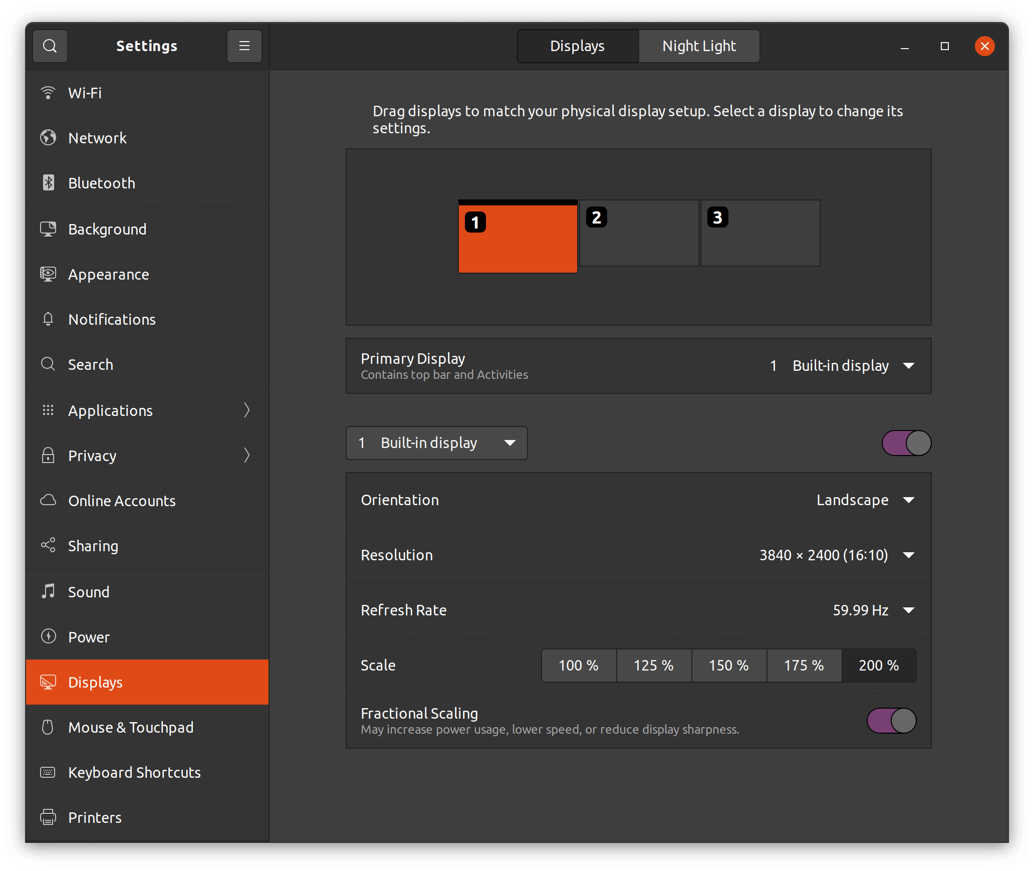 This time I could choose 3840×2400 resolution for the laptop screen with 200% scaling so that icons and fonts don’t look too small. At the same time, I could keep the two external monitors at 1920×1080 resolution with 100% scaling.