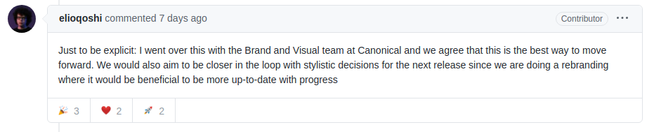 While the Brand and Visual team at Canonical agreed to the default Yaru theme changes, they also want to work closely with the Yaru community design team for the upcoming rebranding, as mentioned by a designer in this GitHub thread: