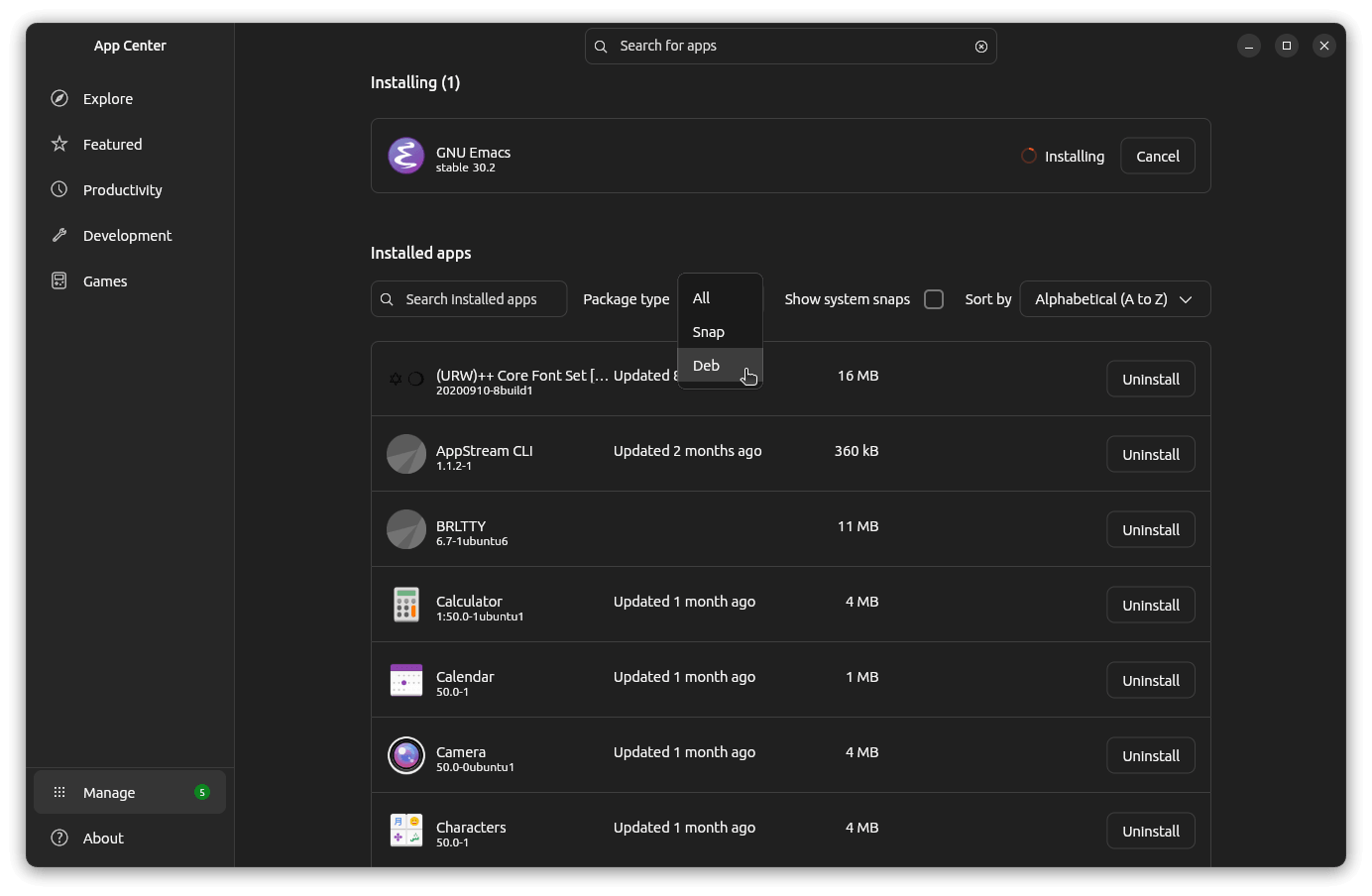 Then there's the App Center, which was updated with several practical additions. In-progress installs are now visible, snap management has improved across the board, and you can now manage third-party DEB packages directly through it.