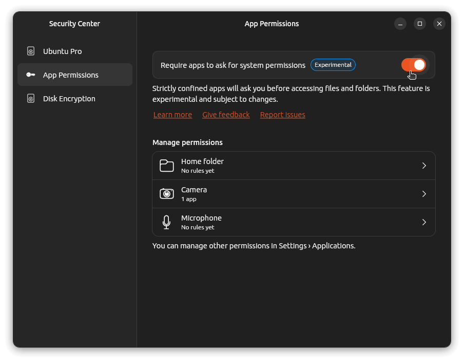 The Security Center is growing into a proper control panel for system security. It now has an experimental permissions prompting feature, which was first seen in Ubuntu 24.10, giving you more granular control over how snapped applications access your Home directory.
