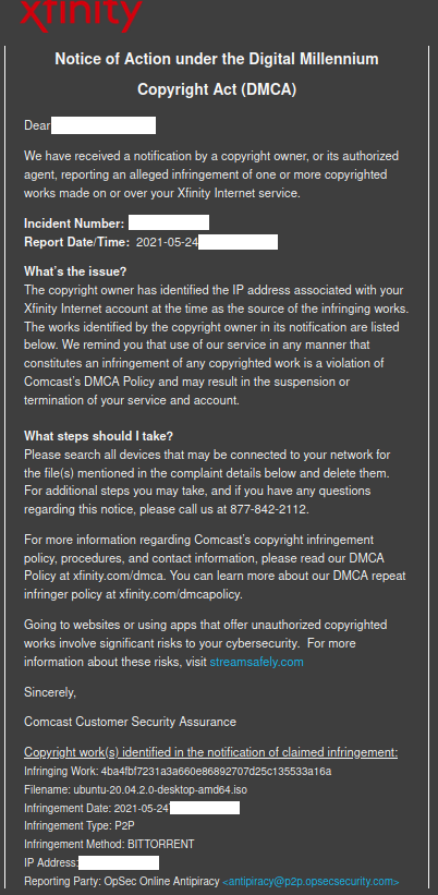 Xfinity, an internet service company by Comast has managed to do just that. A subscriber received a DMCA notice for downloading Ubuntu 20.04.2 LTS ISO file.