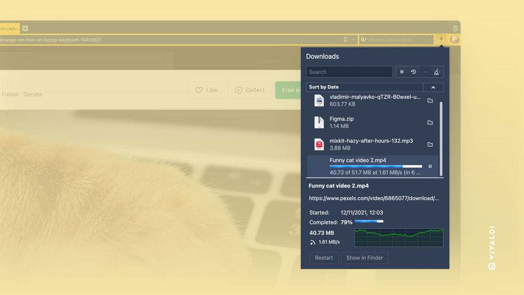 With Vivaldi 5.0, you can finally check download progress using a button in the address bar that would open a pop-up to show your downloads.