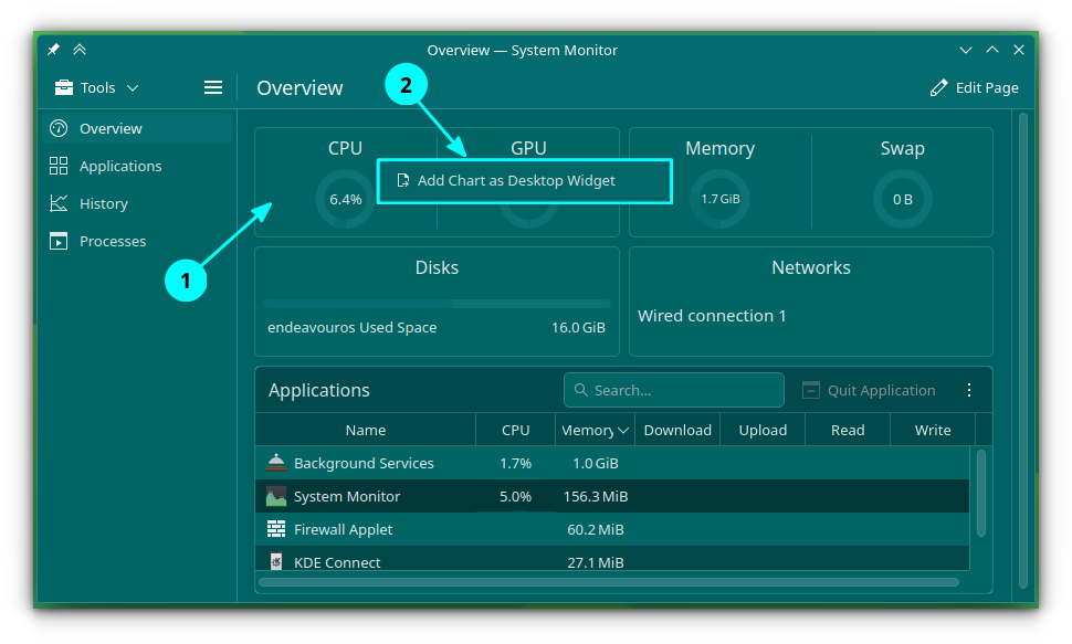 If you are using desktop widgets in KDE Plasma and don't know how to add the system monitor sensor to it, then do this. Open the System Monitor app and right-click on any telemetry you want to add. Then select "Add chart as Desktop Widget".