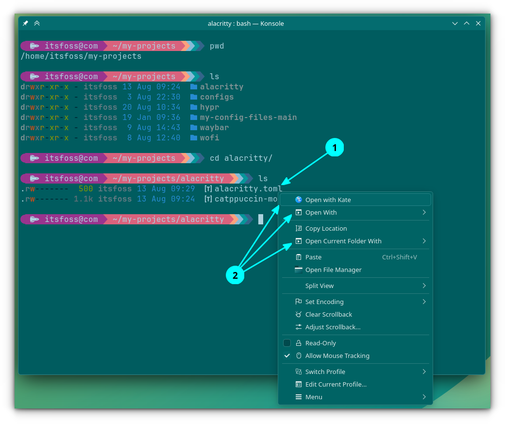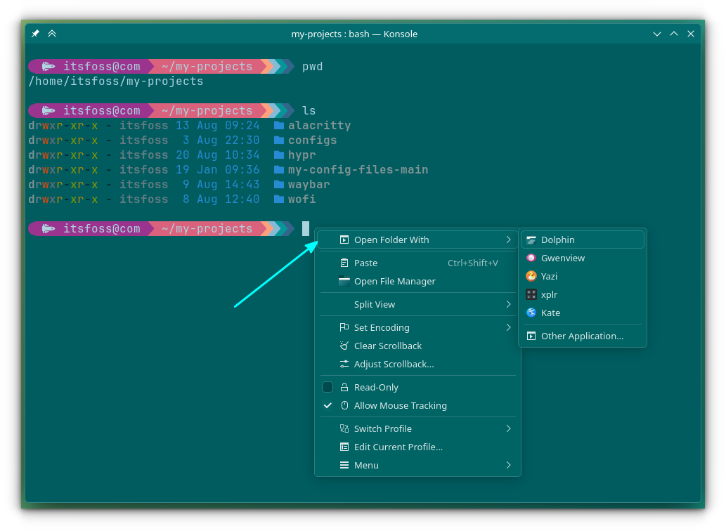 In the Konsole terminal emulator, you can use the right-click context menu to open any folder with a specific tool. For example, if you are inside a directory, right-click and select the "Open Folder With" option.