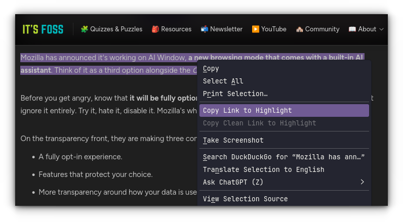 In Firefox's recent versions (143 and above), you can copy and share links to highlight. Select a piece of text on a website you want to bring attention to, then right-click on the selection and click on "Copy Link to Highlight."