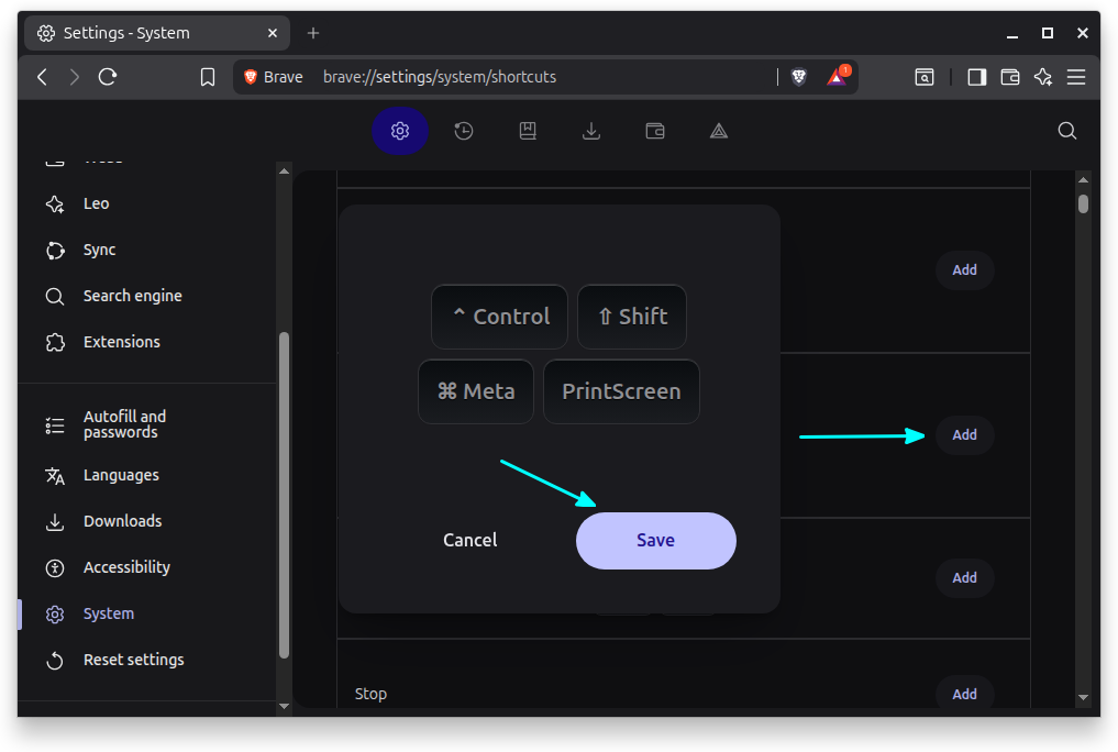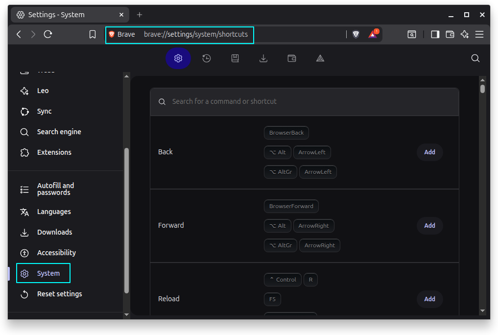 In Brave Browser, you can set custom keyboard shortcuts for various actions. Go to Settings → System → Shortcuts. Here, you can see the currently assigned shortcuts and add new ones here. The interface for doing it is very neat!