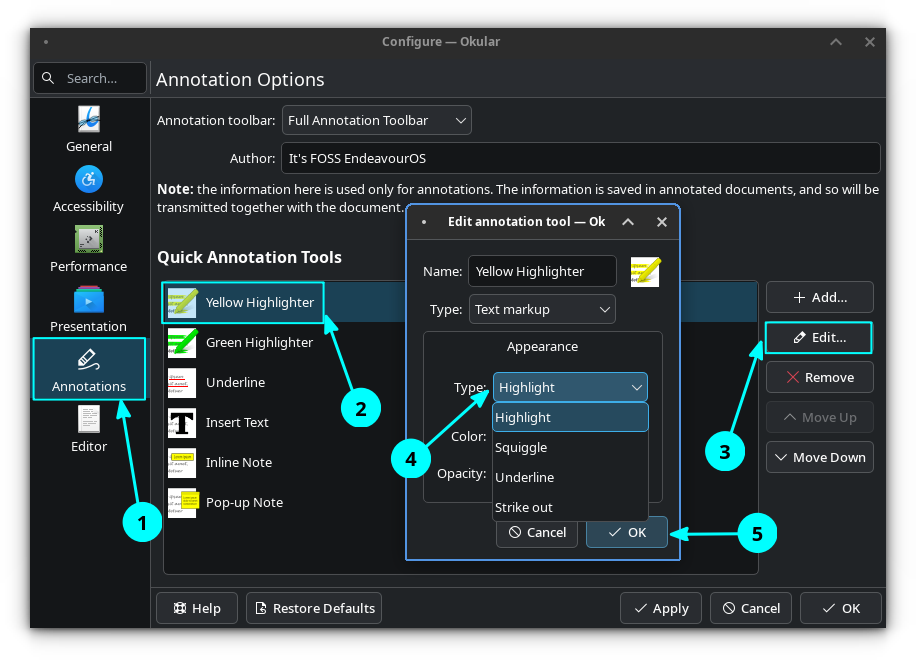 Now, click on the Edit button on the right, and under "Styles," change the highlighter's name, type, color, and opacity.