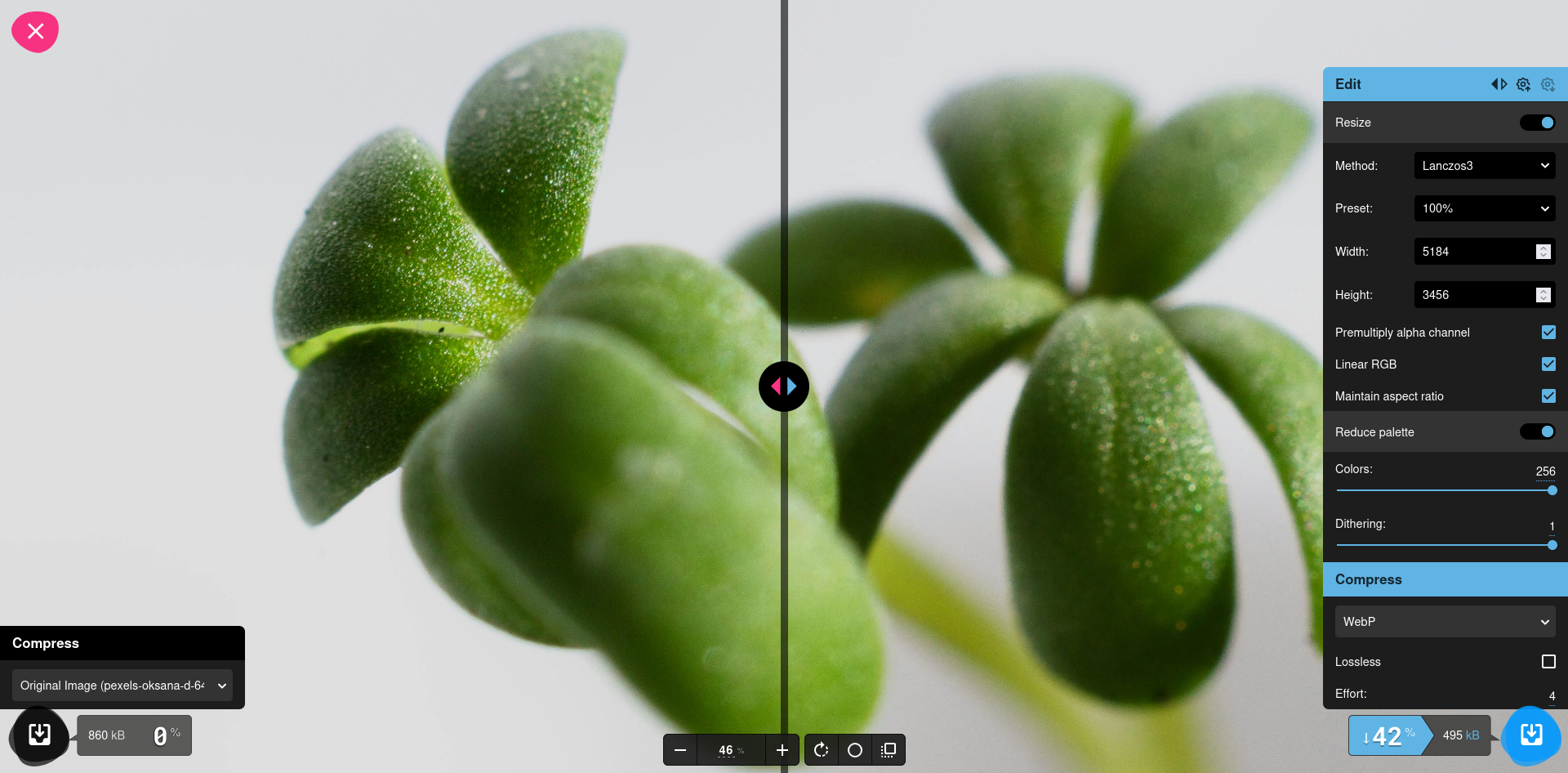 Squoosh supports the major formats, including AVIF, JPEG, PNG, and WEBP, and many codecs and settings that you can adjust and compare side by side. Changes are applied almost immediately, and you can zoom and compare the original and resulting image side by side.