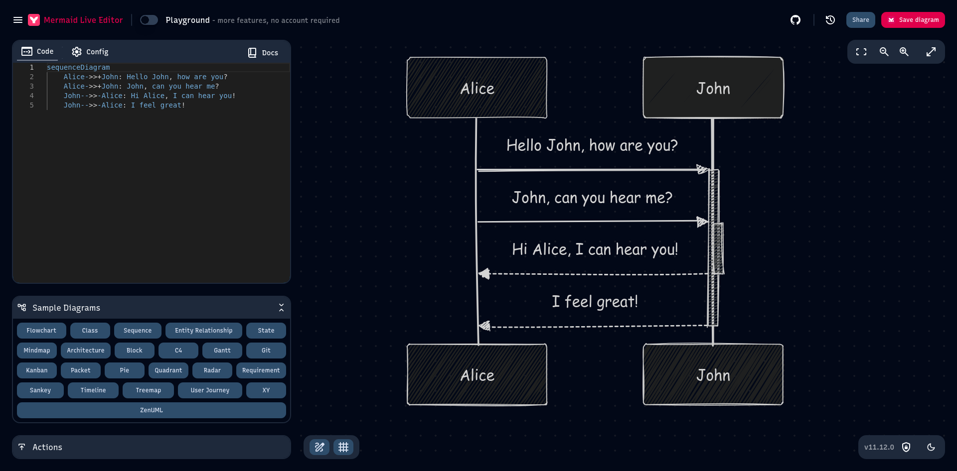 Mermaid Live supports a wide range of diagram types, including flowcharts, sequence diagrams, treemaps, and more. Examples are provided right from the editor, allowing you to get up to speed quickly, even if you've never used it before.