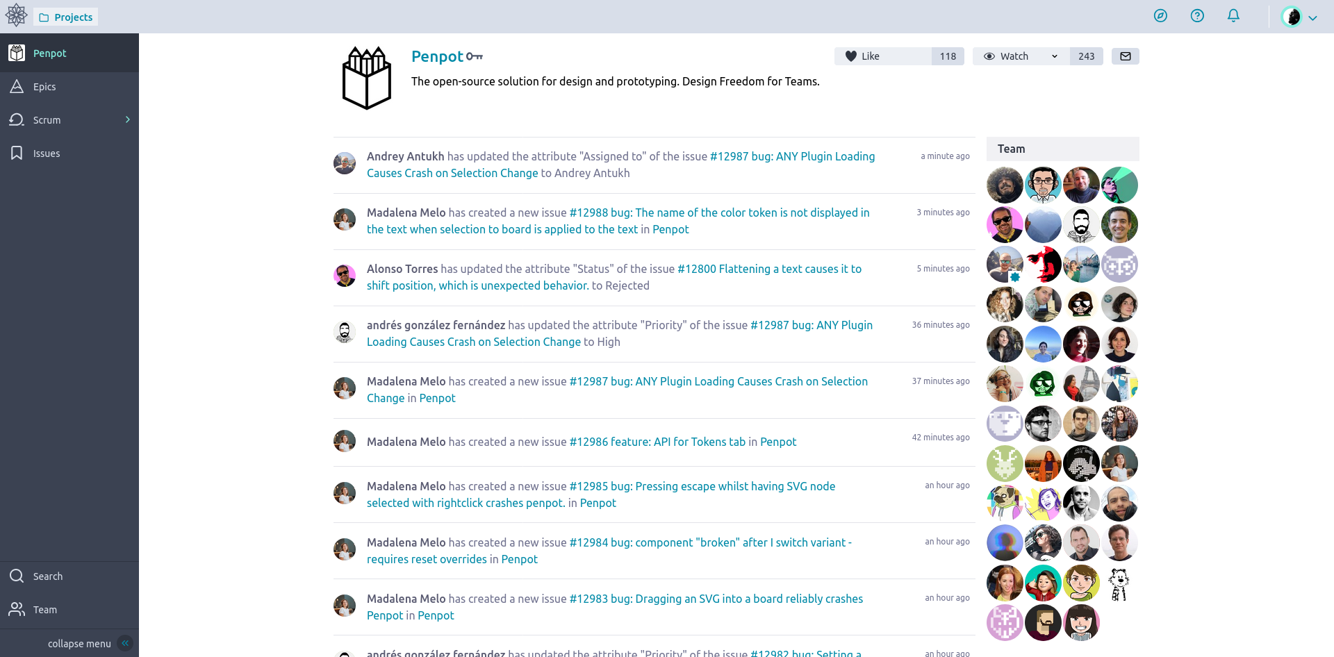 Taiga is an open-source agile project manager that combines both Scrum and Kanban methods in one application. Penpot uses it for project management (the creators of Penpot also created Tiaga). Taiga is built around the primary functions agile teams typically use, including Epics, Scrum, Kanban, and Issues, with extras like Wikis thrown in.
