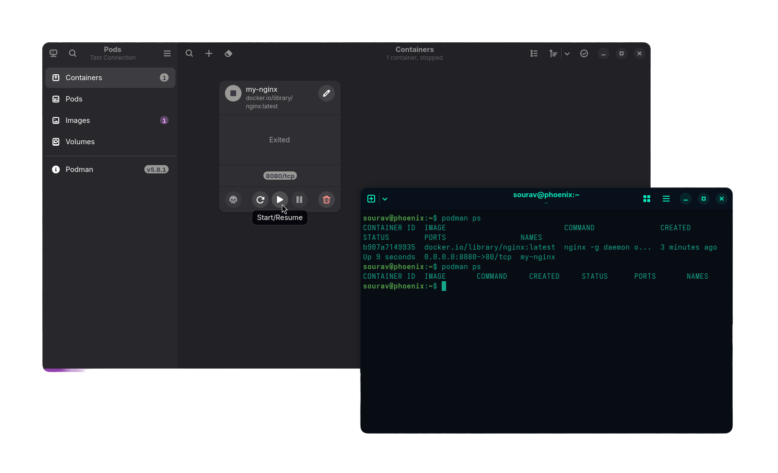 I even double-checked that by running the podman ps command before and after I had used the start/stop toggle, and the results were positive. Pods was able to start and stop a container without much fuss.