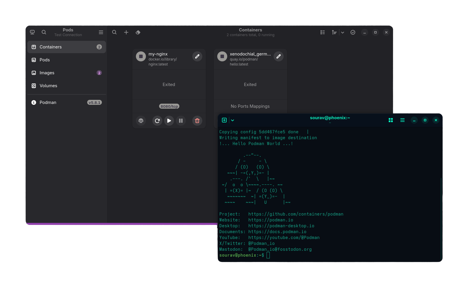 From a single window, you can pull and build images, create containers and pods, start and stop them in bulk, view logs, monitor processes, inspect details, and clean things up when you're done.