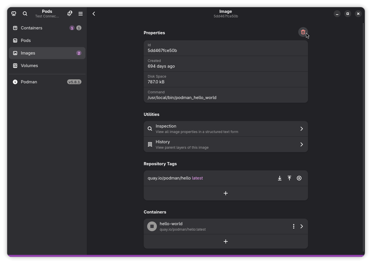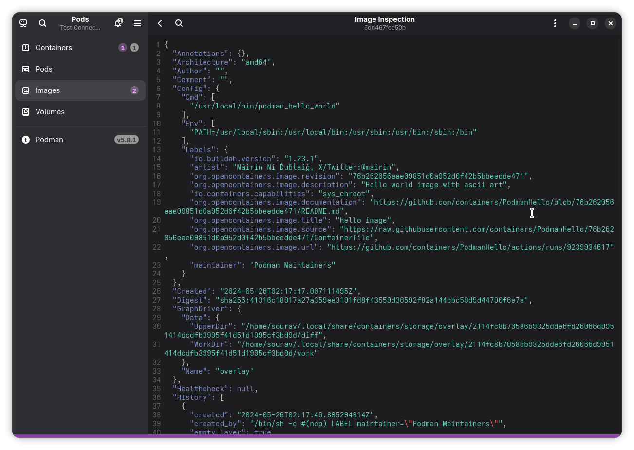 I could also inspect the image properties in structured text for a more detailed look under the hood, browse through the history of the image, and check the repository tags it was associated with.